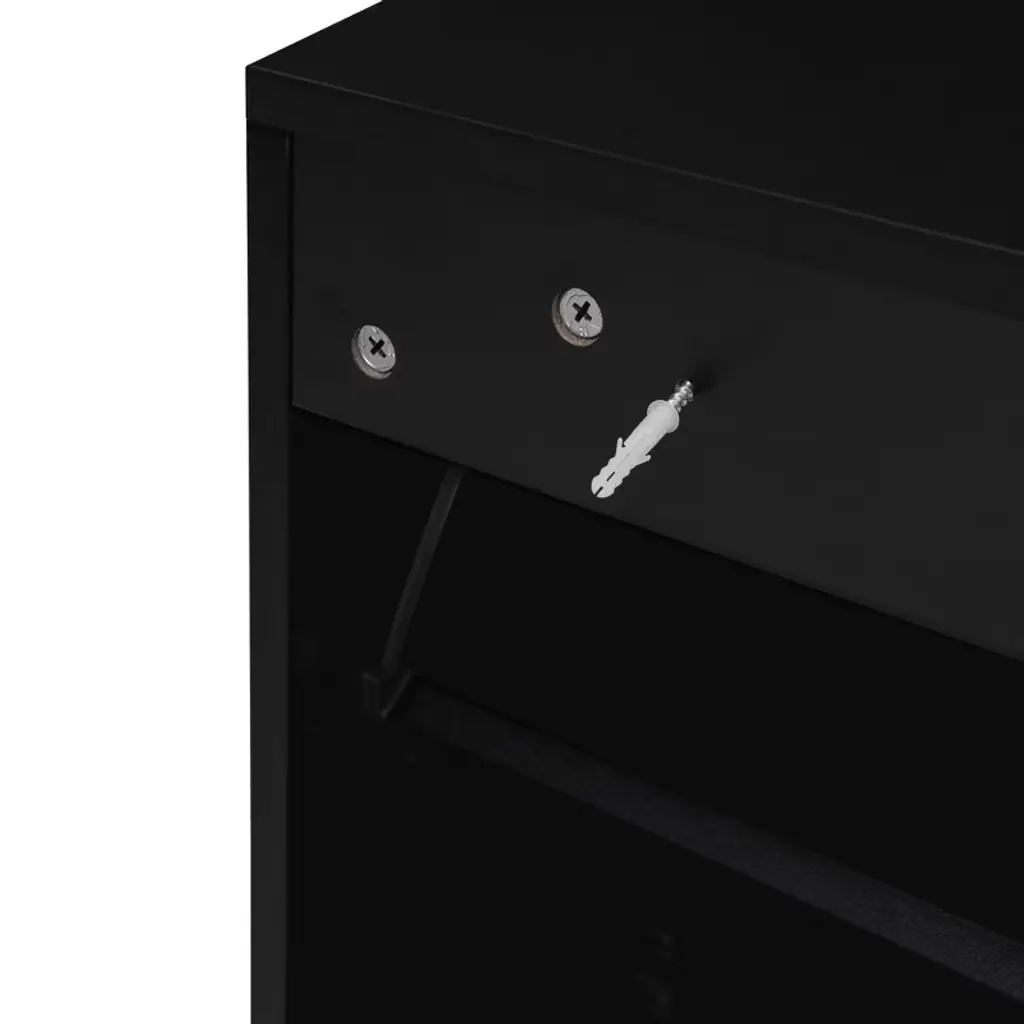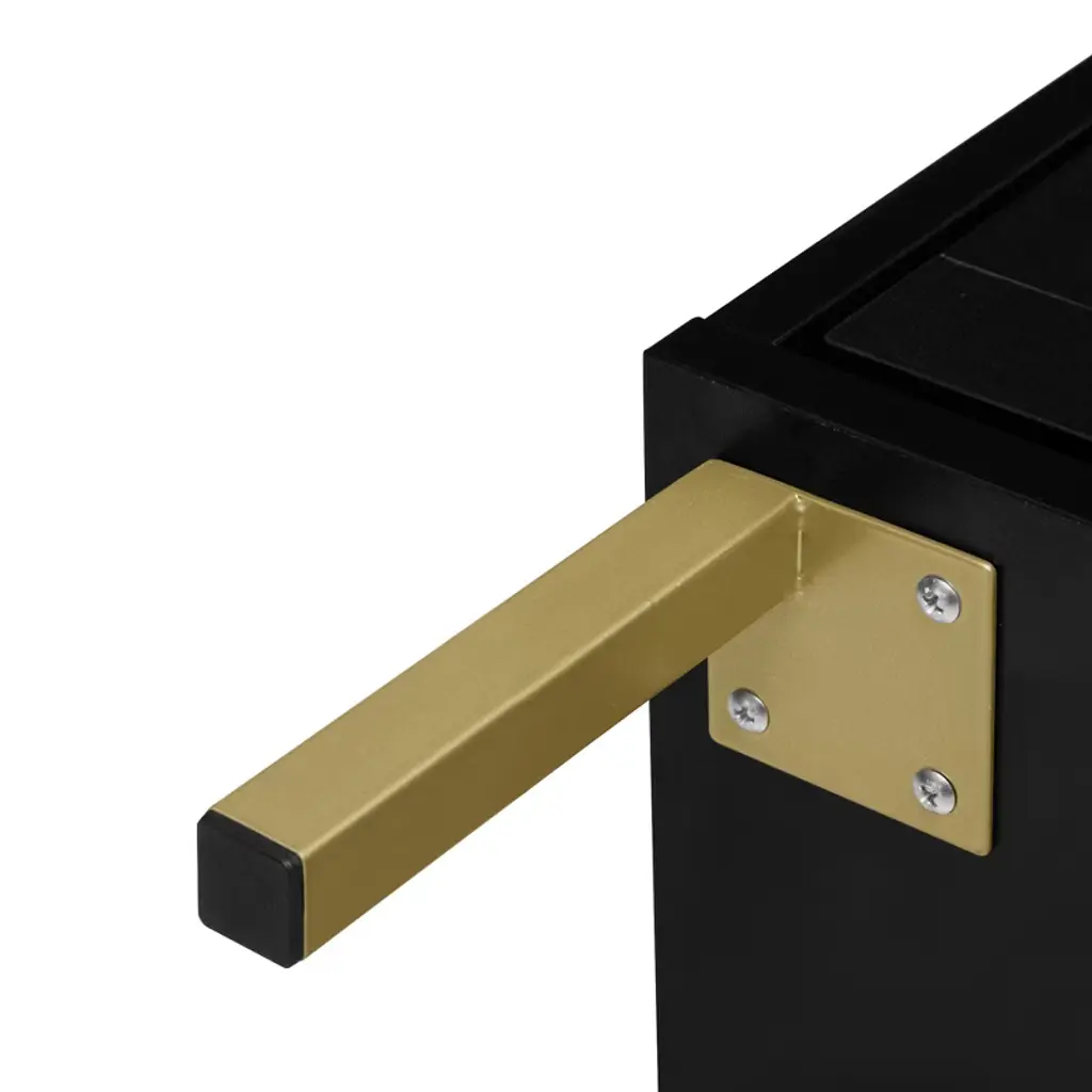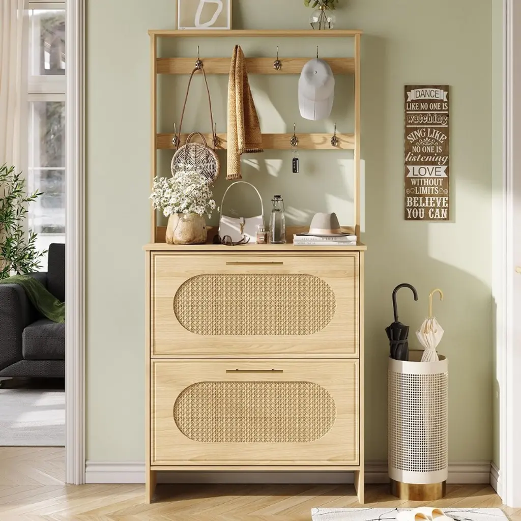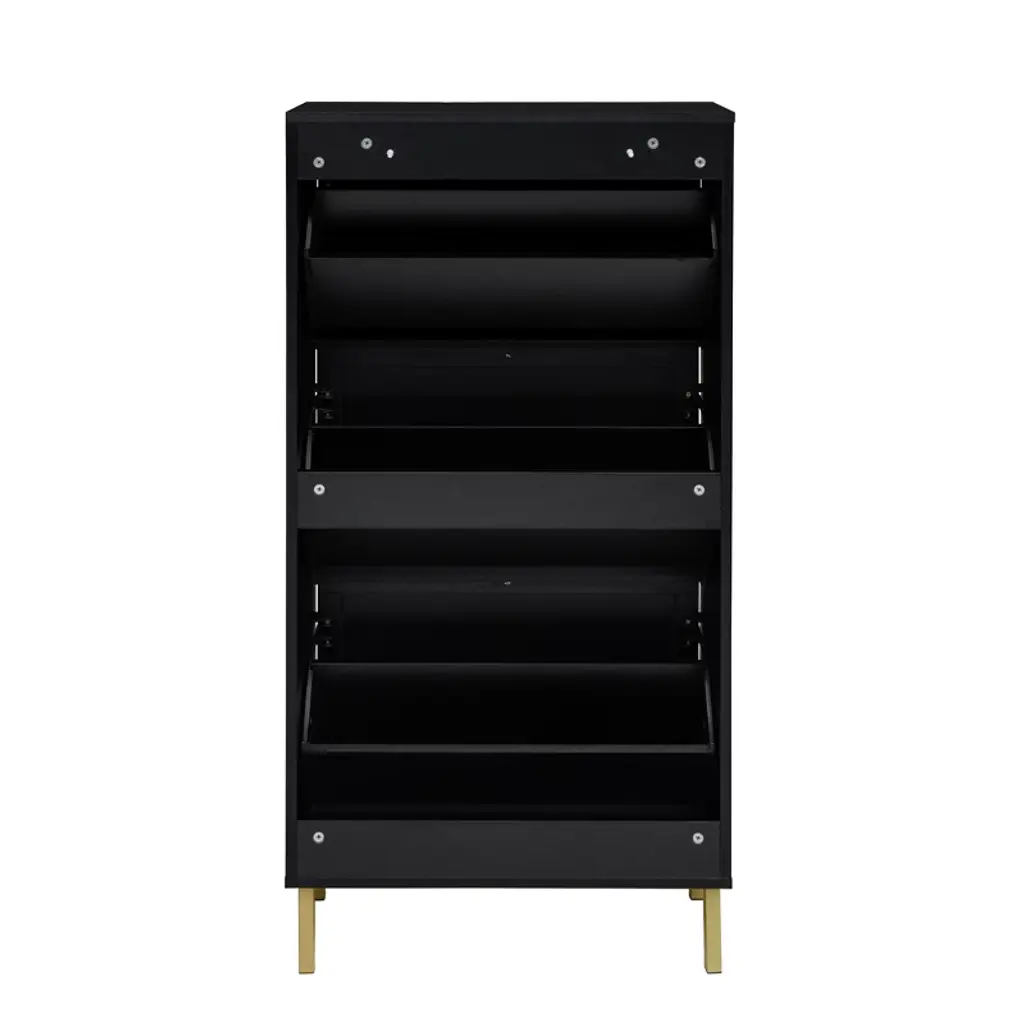 This modern shoe storage cabinet combines practicality and style with engineered rattan construction, gold handles, and a matte-textured metal base. Each layer offers two compartments for flexible shoe organization, helping keep your space tidy. The base can be wall-mounted with two feet or stand independently with four feet, while included foot pads protect floors. Moisture-proof and sun-resistant engineered rattan ensures long-lasting use with a smooth finish. Ideal for entryways, living rooms, studies, or porches, this cabinet is easy to assemble by one person. Material: Particle Board Door Material: Faux Rattan Base Material: Metal Frame Finish: Black Assembly Required Dimensions: 9.25 inches deep x 23.62 inches wide x 48.98 inches high