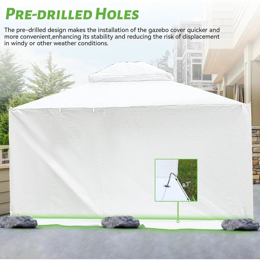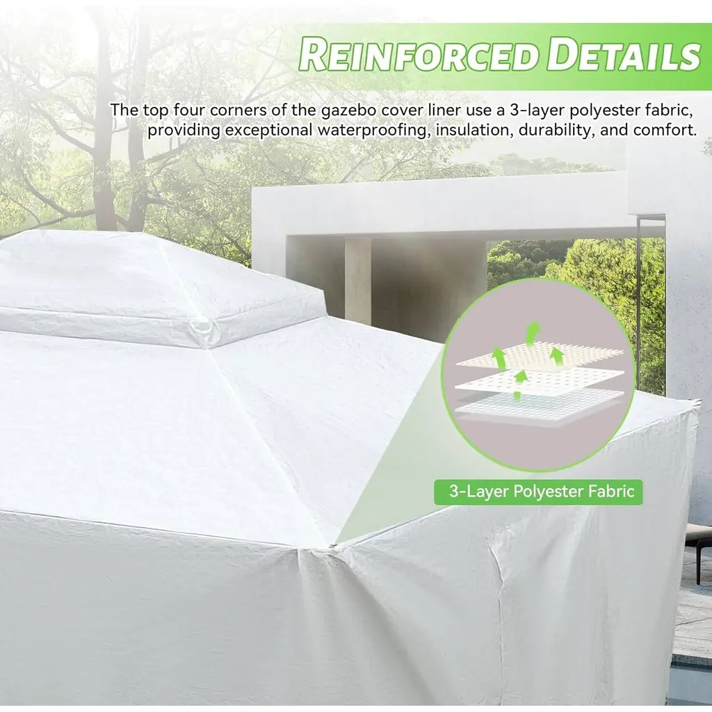 Comprehensive Outdoor Protection Year-Round: Designed for hardtop gazebos, this 12'x14' enclosure delivers full-coverage protection against harsh seasonal elements. Its all-season waterproof performance shields your outdoor space from wind, moisture, and debris with ease. Resilient PE Material Built to Last: Made with high-quality PE material, the cover is engineered for durability and effective water resistance. The fabric maintains structural integrity through rain, snow, and fluctuating temperatures, ensuring reliable performance over time. Convert Your Gazebo into Usable Storage: This cover provides a practical way to winterize your space by turning your gazebo into an enclosed storage zone. It protects patio sets, gardening tools, and other outdoor gear from exposure, keeping everything dry and secure. Windproof Design with Secure Anchoring: The extended 8.7-inch edges and integrated pre-drilled holes enable a tight, stable installation. These features help the cover withstand strong winter winds while maintaining its shape and position for uninterrupted coverage. Convenient Access with Breathable Functionality: Thoughtfully designed with a zippered entry and mesh curtain windows, this cover balances airflow with dust protection. The result is a well-ventilated, private space that remains accessible and easy to maintain.