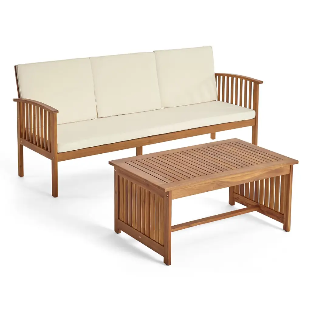 Elevate the style of your patio or backyard with our elegant outdoor sofa and coffee table set, designed to leave a lasting impression on your guests. Crafted with a sturdy acacia wood frame and complemented by water-resistant cushions, this set offers both durability and a sleek, sophisticated appearance. With enough space to comfortably seat up to three people, it provides the perfect setting for relaxed outdoor lounging. Enjoy lasting comfort and timeless design season after season with this inviting addition to your outdoor space. Material: Acacia Wood Cushion Material: Water Resistant Fabric Fabric Composition: 100% Polyester Multiple Finish Options Cushion Color: Cream Assembly Required Sofa Dimensions: 27.25 inches deep x 77.75 inches wide x 33.25 inches high Seat Dimensions: 20.00 inches deep x 74.25 inches wide x 12.25 inches high Sofa Arm Height: 25.50 inches high Table Dimensions: 24.00 inches deep x 40.00 inches wide x 18.25 inches high