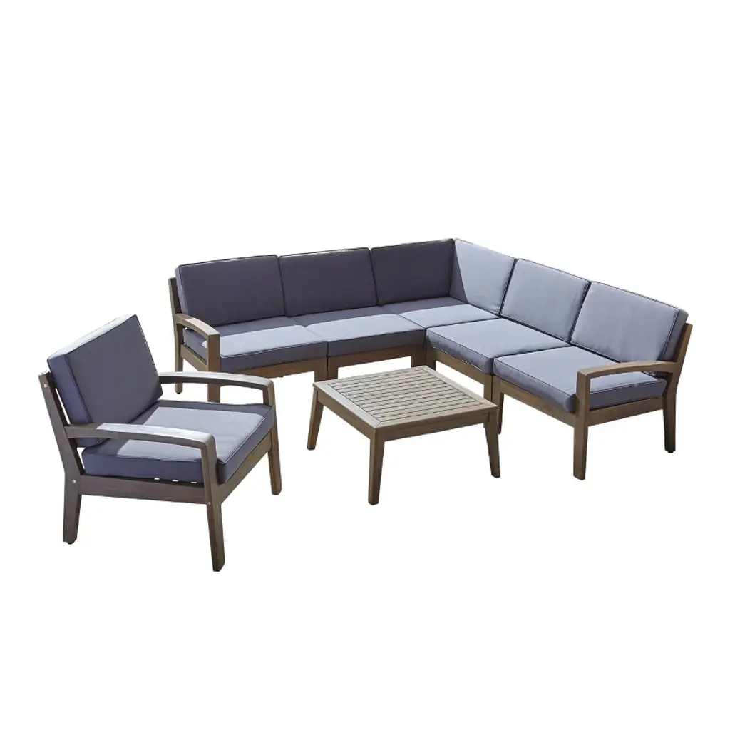 Gdfstudio Parma Outdoor Acacia Wood 6 Seater Sectional Sofa And Club Chair Set With Cushions, Dark Gray/gray