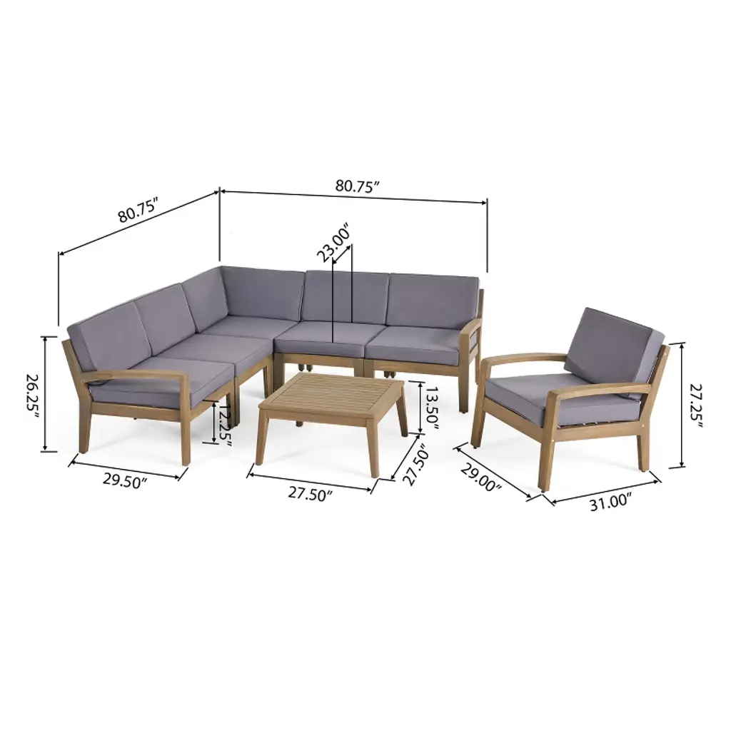 Easily accommodate your guests with a cozy place of conversation at your next backyard get-together. Perfect for those who love to add a personal touch to their home, this sectional and club chair set is easily customized to suit your space. Our sectional offers plush water-resistant cushions for effortless outdoor lounging, making this your new favorite place to relax. Boasting a rich acacia wood frame and beautiful slat design, our sectional set will round out your deck or backyard space with much-needed style and function. Frame Material: Acacia Wood Cushion Material: Water-Resistant Fabric Fabric Composition: 100% Polyester Multiple Frame Finish Options Multiple Cushion Color Options Some Assembly Required Corner Piece Dimensions: 29.50 inches deep x 29.50 inches wide x 26.25 inches high Corner Piece Seat Dimensions: 23.00 inches deep x 23.00 inches wide x 12.25 inches high Right-Side Piece Dimensions: 29.50 inches deep x 27.00 inches wide x 26.25 inches high Right-Side Piece Seat Dimensions: 23.00 inches deep x 24.25 inches wide x 12.25 inches high Right-Side Piece Arm Height: 20.50 inches Left-Side Piece Dimensions: 29.50 inches deep x 27.00 inches wide x 26.25 inches high Left-Side Piece Seat Dimensions: 23.00 inches deep x 24.25 inches wide x 12.25 inches high Left-Side Piece Arm Height: 20.50 inches Armless Piece Dimensions: 29.50 inches deep x 24.25 inches wide x 26.25 inches high Armless Piece Seat Dimensions: 23.00 inches deep x 24.25 inches wide x 12.25 inches high Club Chair Dimensions: 31.00 inches deep x 29.00 inches wide x 27.25 inches high Club Chair Seat Dimensions: 22.75 inches deep x 22.75 inches wide x 12.50 inches high Club Chair Arm Height: 20.50 Coffee Table Dimensions: 27.50 inches deep x 27.50 inches wide x 13.50 inches high