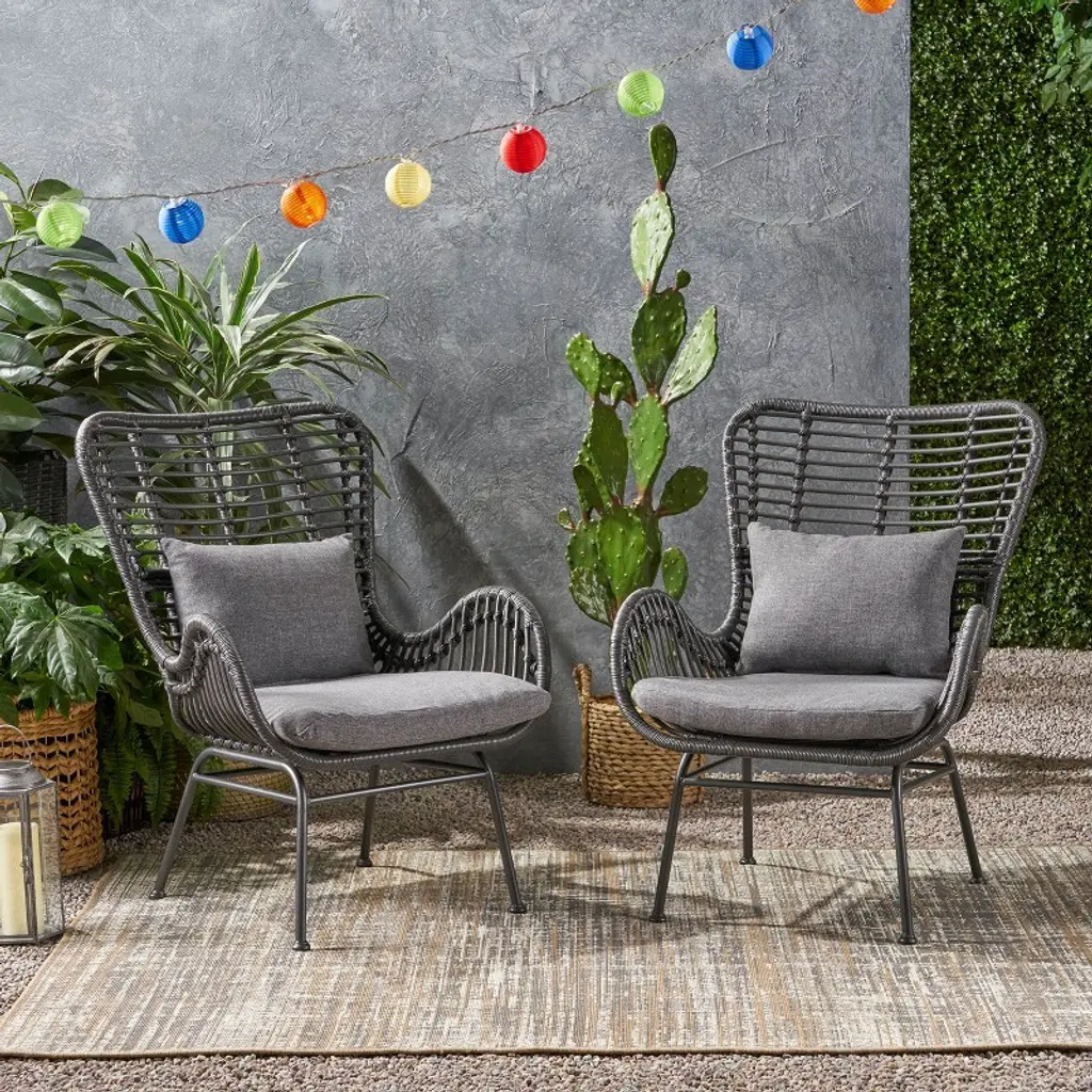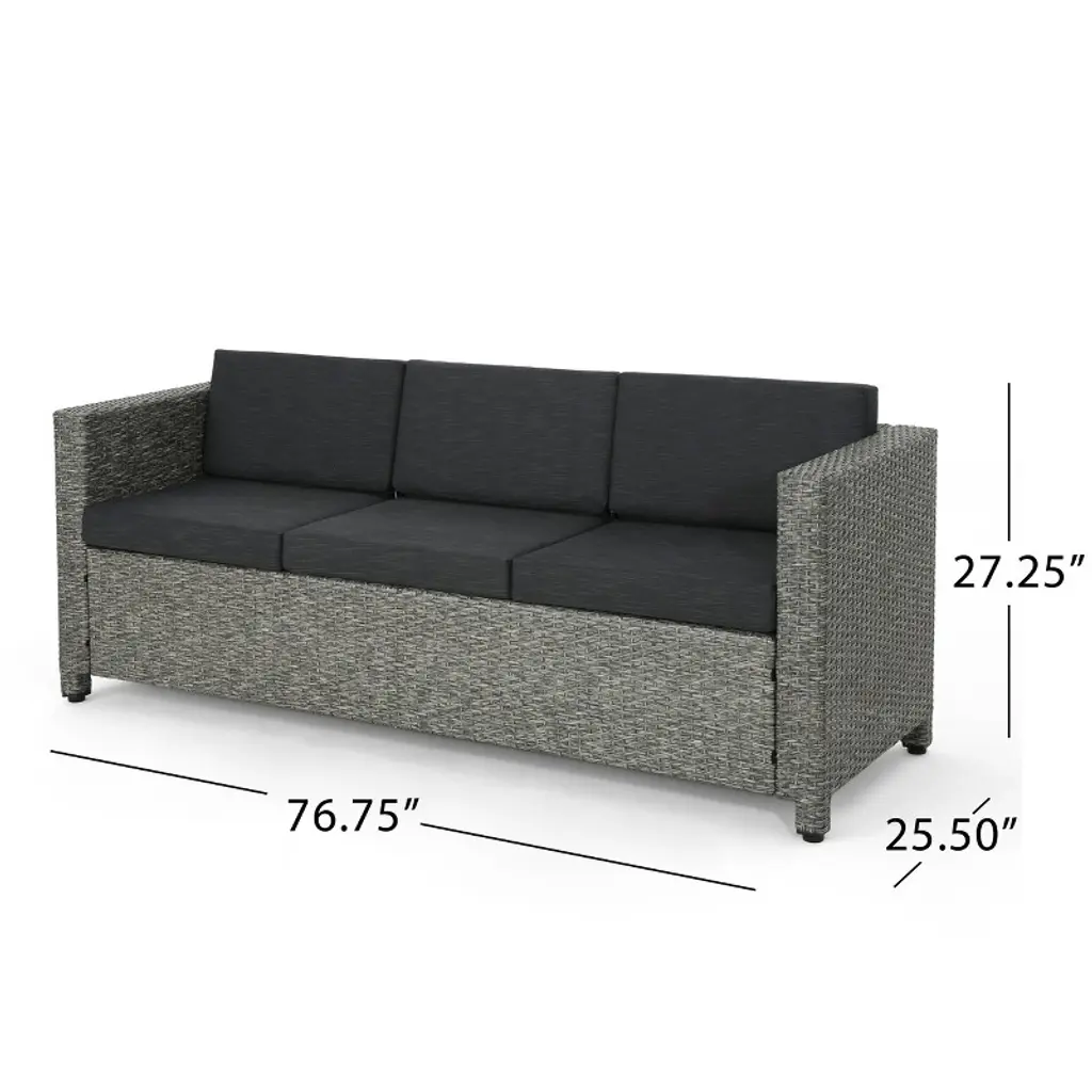 Enjoy watching the birds play with this charming three seater sofa. You can lounge in comfort with your significant other while relishing in the outdoors. This set features water resistant cushions for a fearless summer relaxation. Enjoy your patio again with this lovely sofa. Material: Faux Rattan Frame Material: Steel Cushion Material: Water Resistant Fabric Composition: 100% Polyester Multiple Finish Options Multiple Cushion Color Options Assembly Required Dimensions with Cushions: 25.50 inches deep x 76.75 inches wide x 30.30 inches high Seat Dimensions with Cushions: 19.75 inches deep x 68.75 inches wide x 15.25 inches high Height without Cushion: 27.25 inches Seat Cushion Thickness: 3.50 inches Arm Height: 27.25 inches Weight Capacity: 1200 lbs