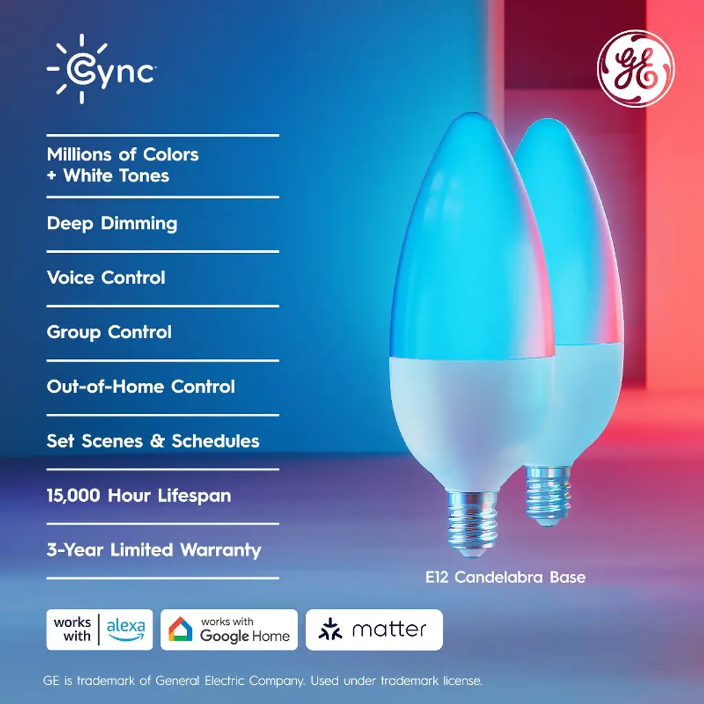 The Full Color Direct Connect GE Cync Smart Bulb makes it simple to add smart control to any fixture and change any room décor aesthetic. Use millions of colors to change a kids' room with their interests, to create a next level movie night, and support your team on game day with these color changing LED lights. Each smart indoor light bulb has a tunable white spectrum that supports your sleep/wake cycle and creates the perfect scene for winding down or waking up. Get added confidence with our smart WiFi bulbs by scheduling your lights via the Cync App, powered by Savant, so you never come home to a dark house. With the ability to control your lights away from home, these decorative LED light bulbs provide the added convenience of controlling your lights while away on vacation. The smart WiFi light bulbs also allow voice control with Amazon Alexa and Google Assistant smart home devices when your hands are full. With Matter compatibility, easily connect directly to leading smart home devices (sold separately) and apps such as Amazon Alexa, Google Assistant, Samsung SmartThings and Apple Home for hands-free voice control. These WiFi smart bulbs connect directly to a 2.4 GHz WiFi connection via the Cync App, no additional hardware needed.