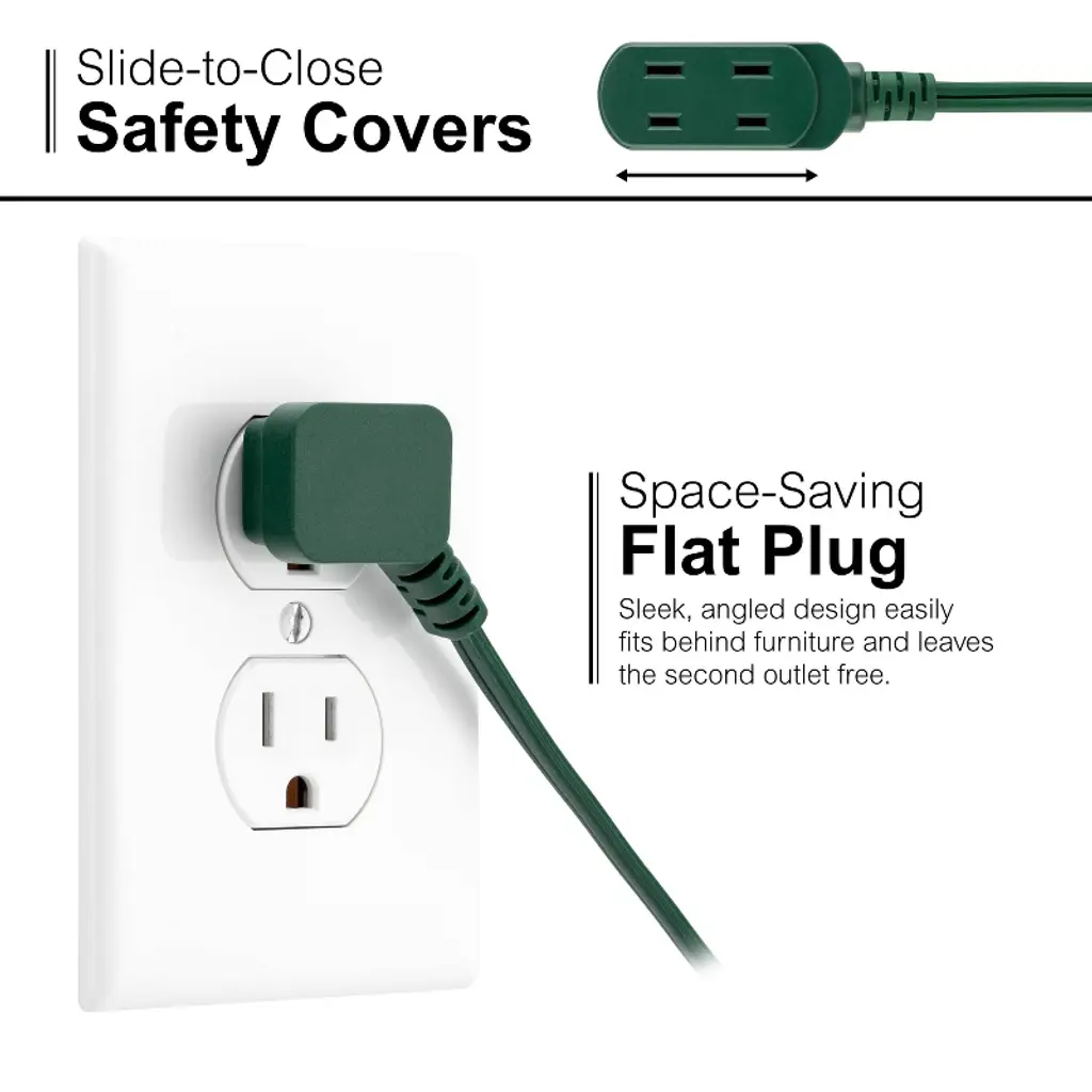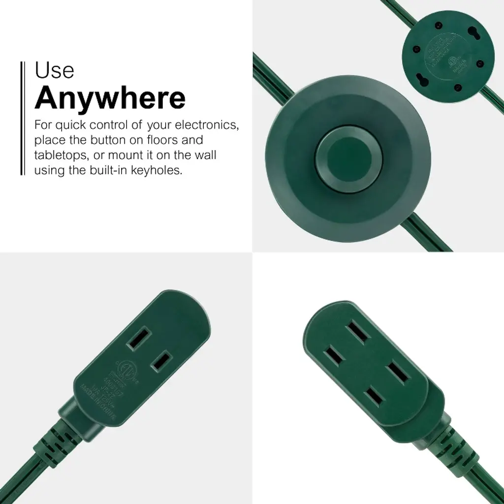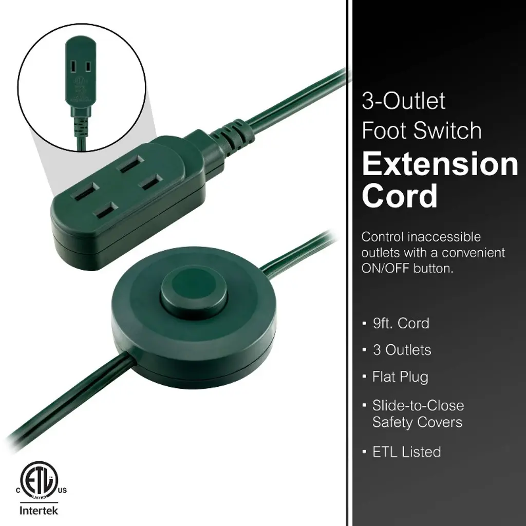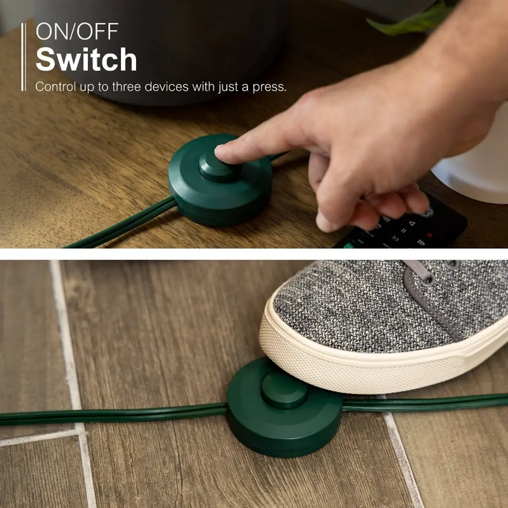 Keep power within reach with the GE-branded Indoor Foot Switch Extension Cord. Three polarized outlets and one handy foot switch lets you easily turn ON/OFF multiple lighting sources, seasonal décor and more with one button press. Now there’s no need to strain to reach light or appliance switches in tight spaces or move furniture to access outlets. Simply connect your lamp, seasonal lights or other electronics with two-prong plugs to the extension cord’s three polarized outlets and place the ON/OFF power button foot switch in your desired location. The user-friendly ON/OFF switch draws zero power from your devices when it’s in the OFF setting and saves money by only using your electronics when needed. The foot switch extension cord’s flat plug fits snugly against the wall so it’s easily concealed behind furniture, and the extra-long 9ft. green power cord blends perfectly with holiday and other décor. Slide-to-close outlet safety covers keep unused outlets closed, providing an extra level of security to protect your home and family. This plug-in power switch is ETL listed and backed by a limited-lifetime replacement plan for added peace of mind. Take control of inconvenient, hard-to-reach power switches with the GE-branded Indoor Foot Switch Extension Cord.