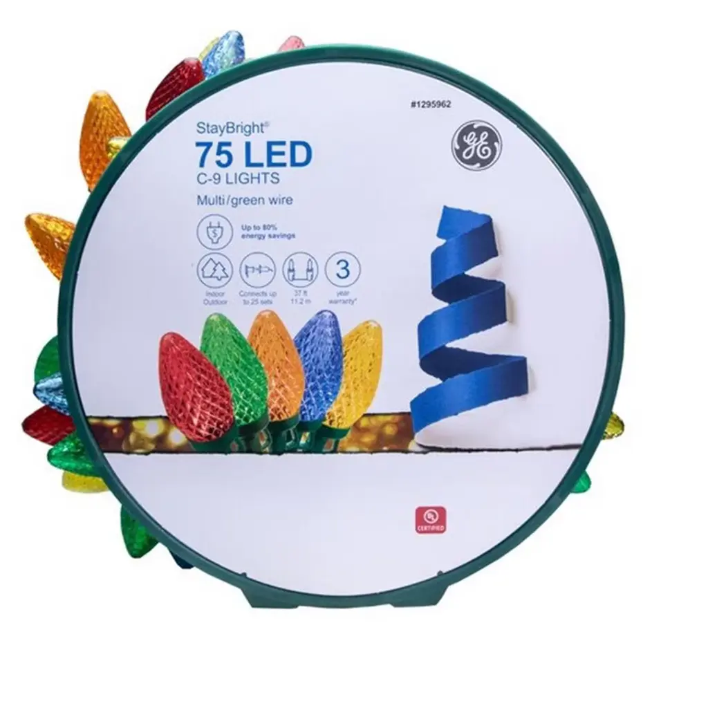 GE StayBright LED C9 diamond cut 75-count multicolor light set on storage reel. 6-Inch lead wire, 6-inch lamp spacing, 6-inch end connector plug, 37-feet lighted length, and green cord set with fused plug. Features: GE C9 LED Christmas string lights on a storage reel. 75-Count, multicolor diamond cut StayBright LED lights. 37-Feet lighted length, green cord with fused plug. Can connect up to 25 sets. Replacement bulbs and fuses included for added convenience. Indoor/Outdoor