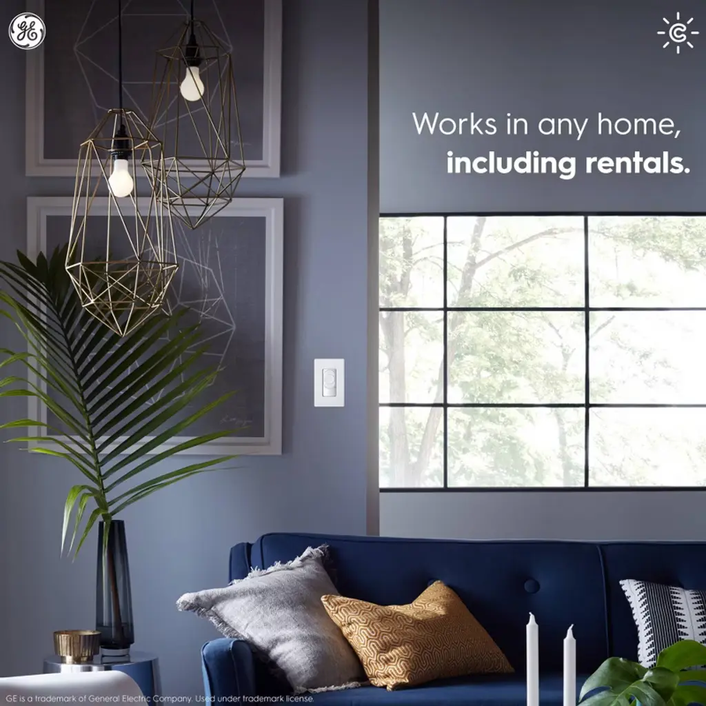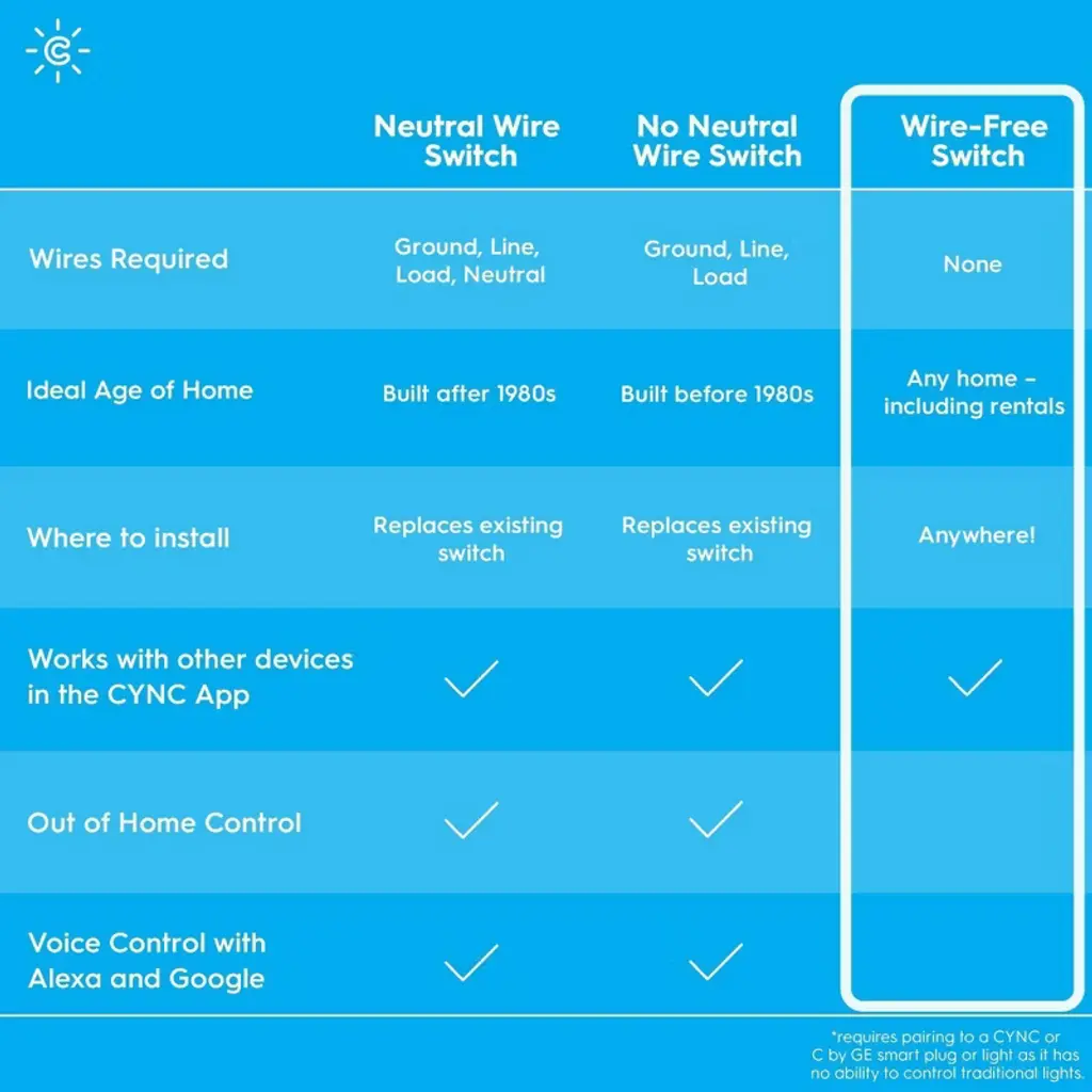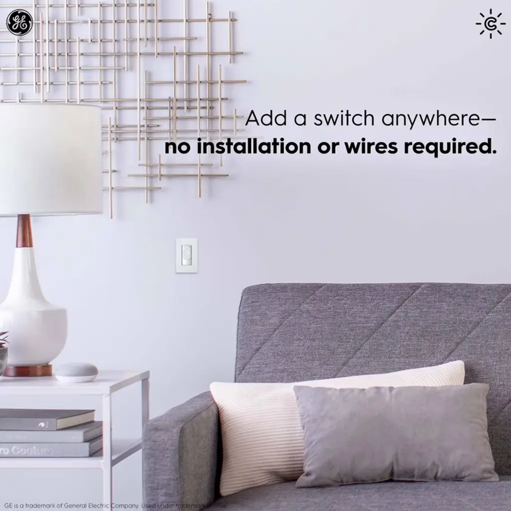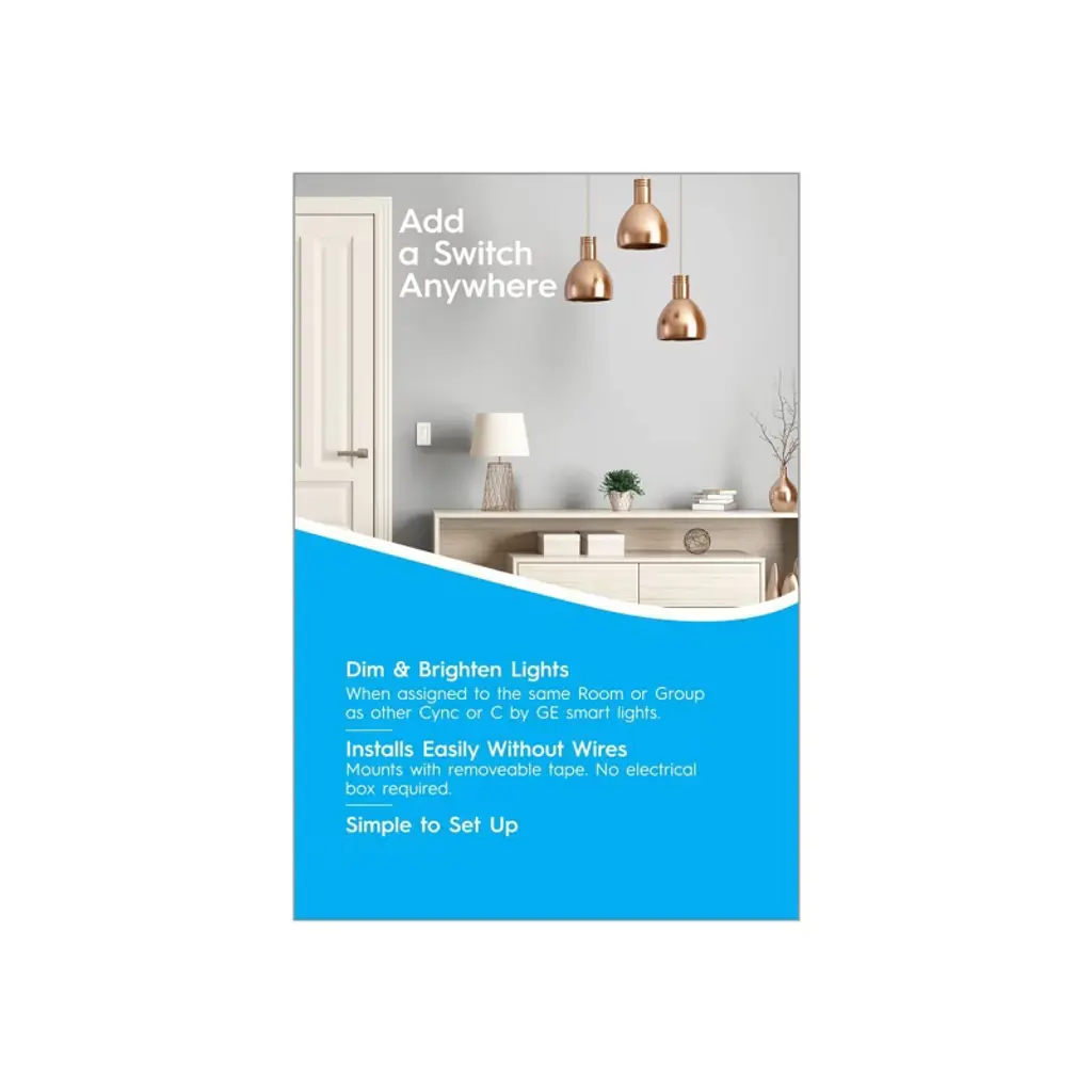 The Wire-Free Smart Dimmer Switch adds lighting touch control anywhere. The smart Bluetooth switch connects wirelessly to CYNC and C by GE Smart Bulbs, Smart Plugs and Smart Switches only to provide whole room control. You can turn lights on and off, brighten and dim from anywhere in the room. Want a switch closer to your bed or one that's reachable when you walk into your front door? Place a Wire-Free Smart Switch where there isn't a switch today with no wires or screws needed making it perfect for rentals or dorm rooms. The Wire-Free Smart Switch includes removable tape and a replaceable battery that's rated to last over two years. Pair with other CYNC and C by GE switches, bulbs and plugs in the Cync App and create 3-way connections, control electric devices like fans and space heaters and use touch to turn off lights on different circuits. WARNING: This product contains a lithium button/coin cell battery. Keep coin cell batteries out of reach of children.