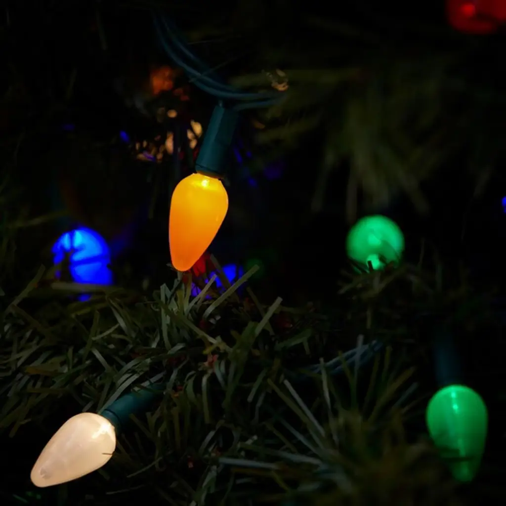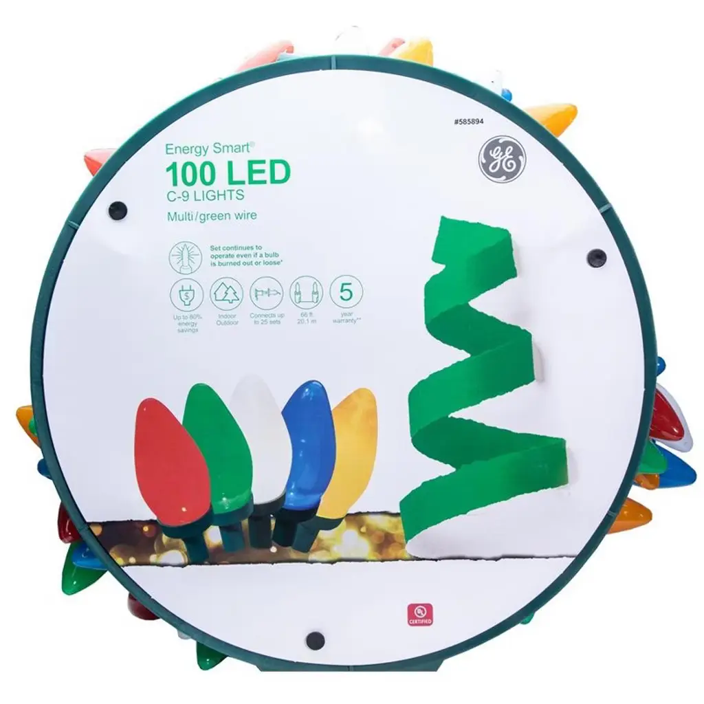 GE Energy Smart 100 LED C-9 multicolor light set on storage reel. 6-Inch lead wire, 8-inch lamp spacing, 6-inch end connector plug, 66-feet lighted length, and green cord set with fused plug. GE C-9 LED Christmas string lights on a storage reel. 150-Count multicolor LED lights continue to operate even if a bulb is burned out or loose. Can connect up to 25 sets. Replacement bulbs and fuses included for added convenience. For indoor or outdoor use.