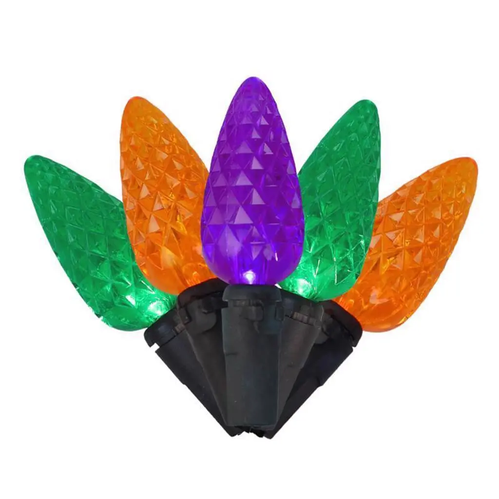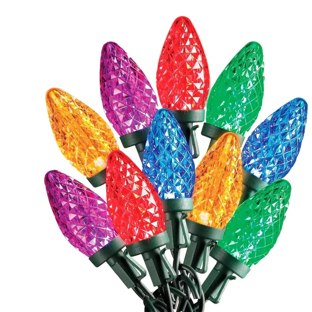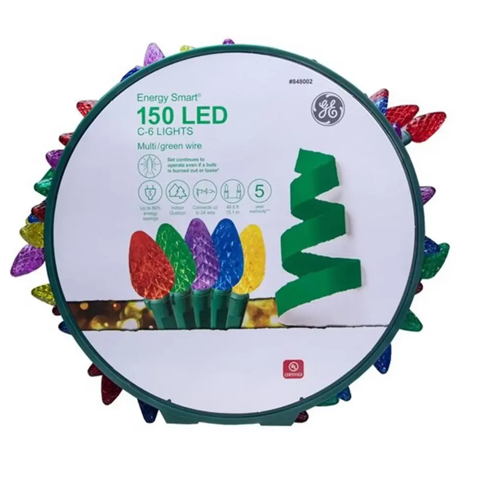 GE Energy Smart 150 LED Faceted C-6 faceted cut 150-count multicolor light set on storage reel. 6-Inch lead wire, 4-inch lamp spacing, 6-inch end connector plug, 49.6-feet lighted length, and green cord set with fused plug. GE C-6 LED Faceted Christmas string lights on a storage reel. 150-Count multicolor LED lights continue to operate even if a bulb is burned out or loose. Can connect up to 24 sets. Replacement bulbs and fuses included for added convenience. For indoor or outdoor use.