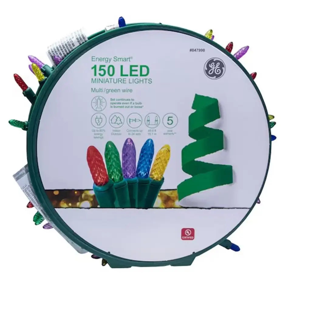 GE Energy Smart LED 7mm faceted 150-count multicolor light set on storage reel. 6-Inch lead wire, 4-inch lamp spacing, 6-inch end connector plug, 49.6-feet lighted length, and green cord set with fused plug. GE Miniature LED faceted Christmas string lights on a storage reel. 150-Count multicolor LED lights continue to operate even if a bulb is burned out or loose. Can connect up to 24 sets. Replacement bulbs and fuses included for added convenience. For indoor or outdoor use.