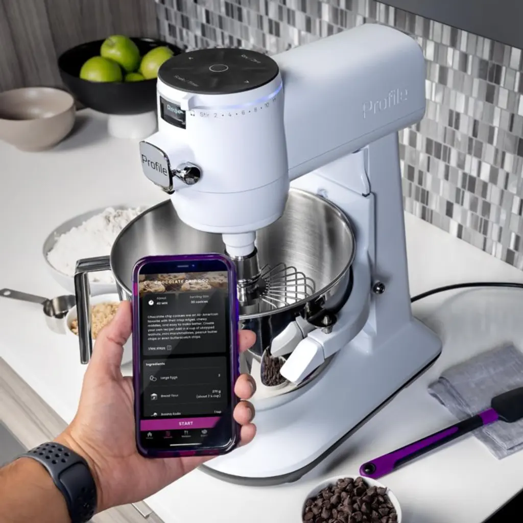 Loaded with ingenious features, this smart stand mixer takes the guesswork out of making breads, desserts, sauces and more. The built-in scale automatically weighs ingredients for greater accuracy and fewer dirty dishes, and the Auto-Sense technology works with recipes in the SmartHQ app to monitor changes in viscosity so you don't have to. Keep an eye on the mixer's progresseven from across the kitchenwith a glance at the status notification light ring and the digital display that shows the speed, timer and weight of ingredients. Use voice commands for hands-free operation and guided recipes for step-by-step instructions. The powerful motor handles the thickest batters and densest doughs without stalling or overheating, and the appliance turns off automatically when its timer ends so there's no risk of overmixing. Over-the-air updates ensure the white mixer only gets better and more advanced over time.