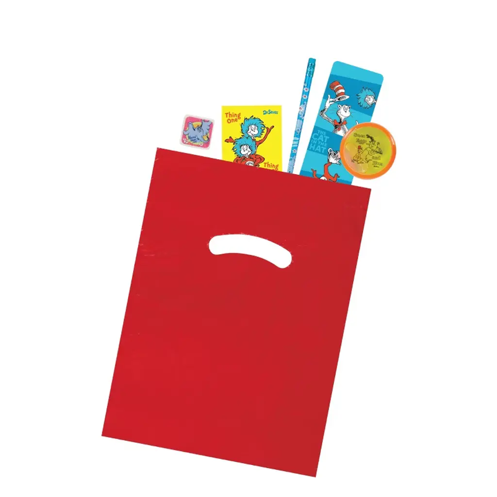Geddes Exclusive! Celebrate Dr. Seuss’ Birthday and the joy of reading with our ready-to-go 5-piece Goodie Bag! Ideal for classrooms, libraries, or any Dr. Seuss™ reading celebration, each pre-filled bag makes giveaways quick and easy. Every bag includes fun, themed supplies like a pencil, bookmark, mini memo pad, eraser, and a container of putty—all packed in a colorful 9" x 12" bag. Assortments and bag colors vary for a fun surprise every time!