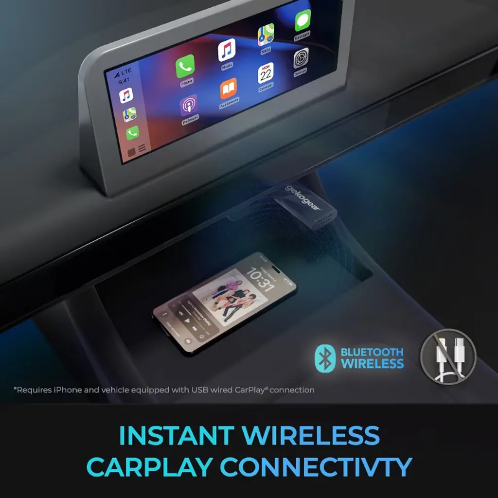 Wish you had wireless CarPlay® in your car rather than wired? There’s an easy solution. The Gekogear™ Orbit A100 is a cutting-edge wireless CarPlay® USB adapter designed to enhance your in-car connectivity experience. This sleek and compact device seamlessly integrates with your vehicle, transforming your infotainment system into a smart hub. The Orbit A100 eliminates the need for cumbersome cables, providing a simple, plug-and-pair connection without the need for complex installations or modifications. Effortlessly enjoy the convenience of CarPlay® functionalities, allowing you to access - lag-free - navigation, music, calls, and messaging with unparalleled ease and safety. The Orbit A100 requires an iPhone® and a vehicle equipped with a USB wired CarPlay® connection.
