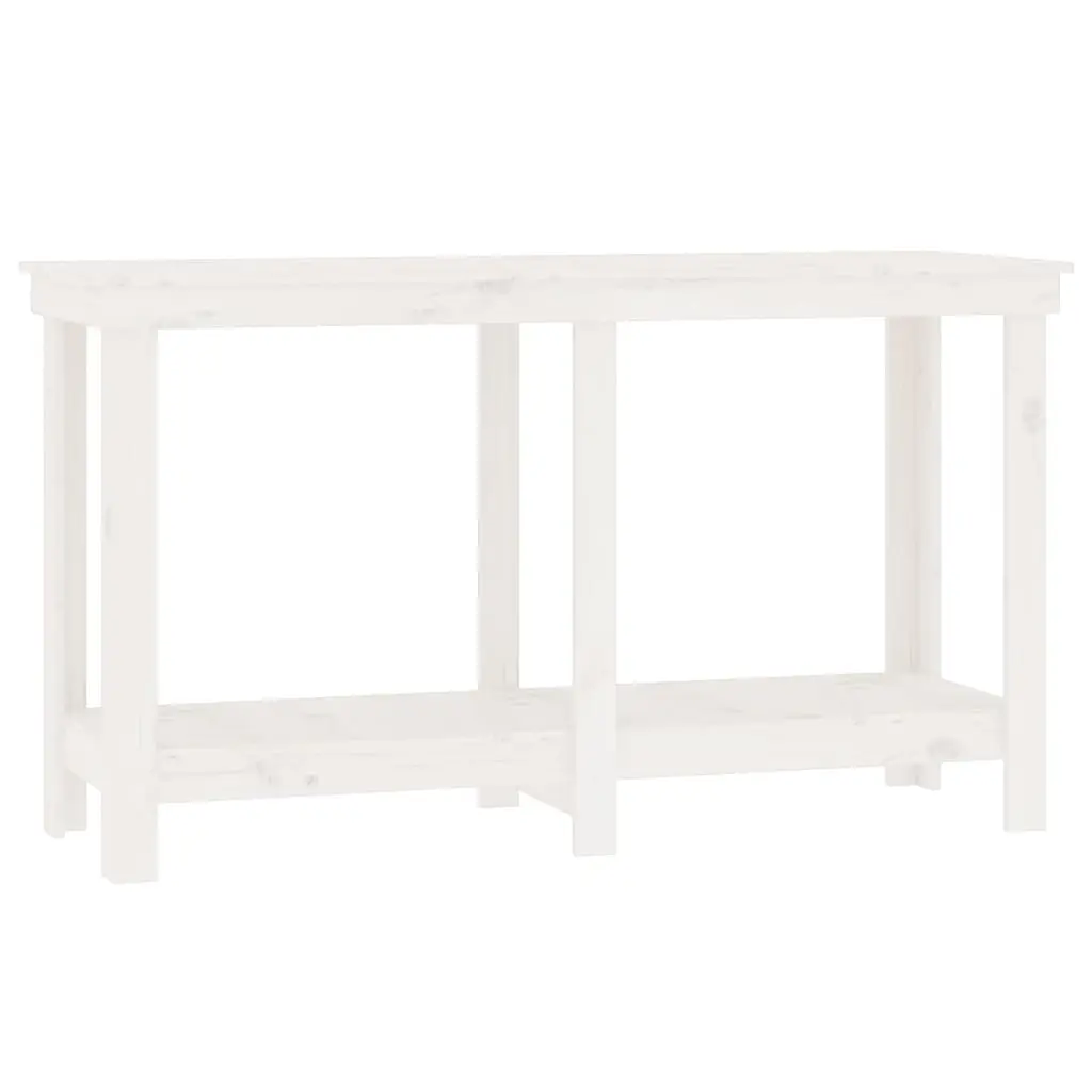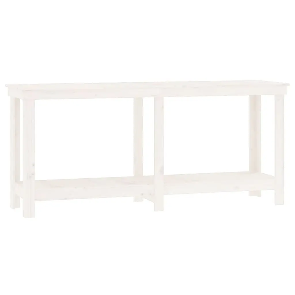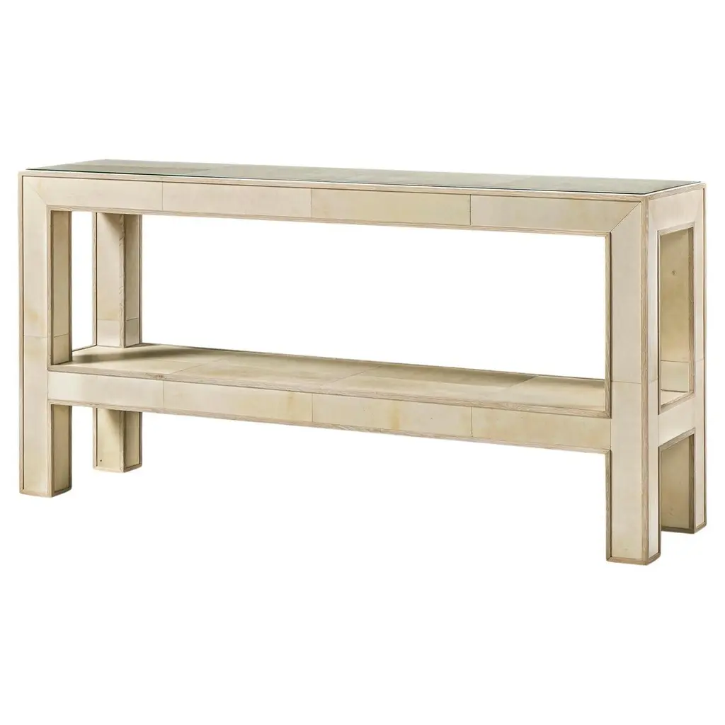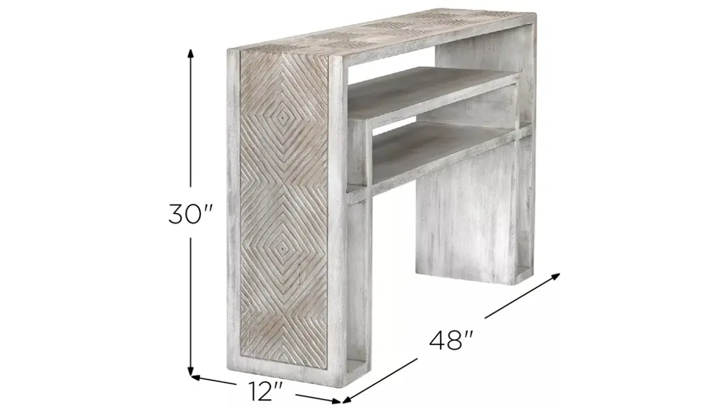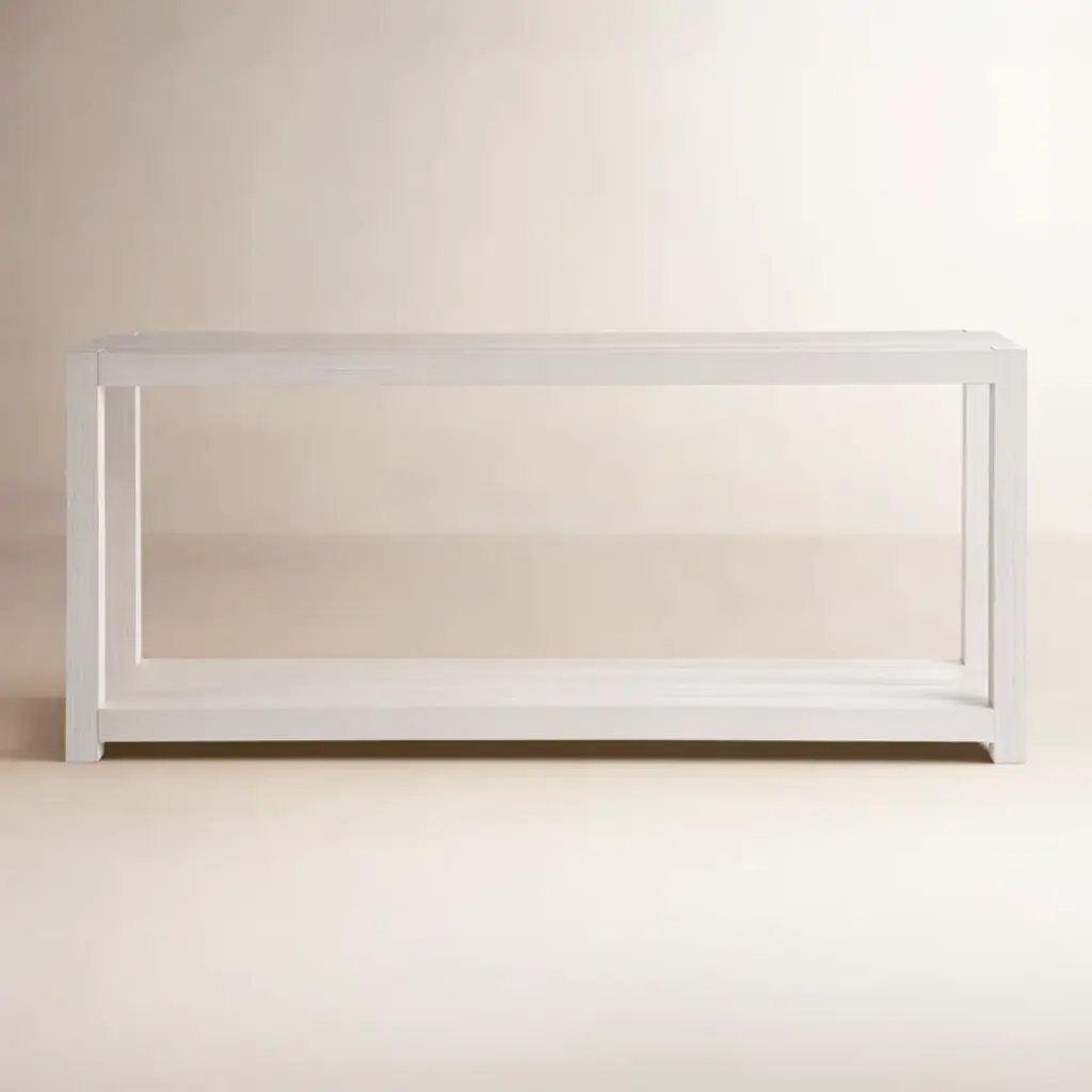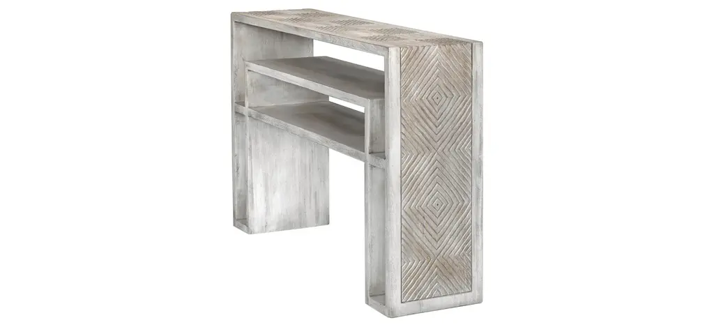 The Genara Console Table is finished in an aged bone-white over mahogany veneer with a multi-level display, featuring a hand carved geometric top in solid mahogany wood in a warm oatmeal wash.