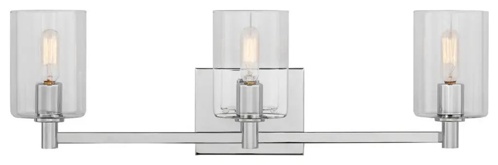 Finish : Polished NickelMaterial : SteelGlass/ Shade : Clear GlassGlass / Shade Size : D:2.5" H:6"Bulb # 1 : 3 Candelabra Torpedo 60wTotal Bulbs : 3Bulbs Included : NoMounting Procedure : Set Screw(s)ETL DampDimensions : W:23.25'''' H:8.5'''' E:5.375''''Weight : 3.7 LBs