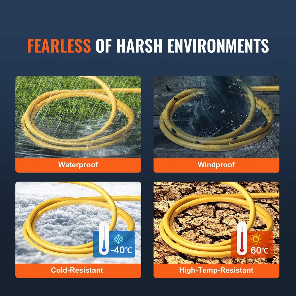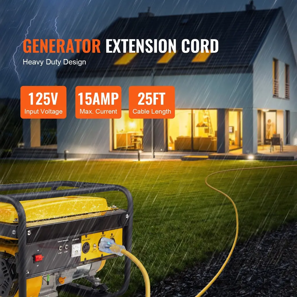 Max. Load 3750W (30-Amp option) / 1875W (15-Amp option) : Our generator extension cord supports loads up to 3750W(125V/30A) / 1875W (125V/15A). 100% all-copper cable conducts electricity faster and more consistently for heavy-duty power tools such as circular saws and grinders. Strong Weather Resistance: The 25-foot generator power cord is both functional and practical. The thickened PVC-wrapped surface is waterproof, wear-resistant, and can be exposed to sunlight for a long time. Remains flexible and works uninterrupted in extreme climates ranging from -40°C to 158°C. Clear LED Indicator(for NEMA L5-30P / Three NEMA 5-15R STJW and NEMA 5-15P/5-15R STJW options): The female end of the heavy-duty generator extension cord is equipped with an LED indicator to show the power on condition at a glance. The eye-catching yellow color makes it easy to find even at night, significantly reducing the risk of touching in the dark. Security Comes First: You can use this SJTW generator electric cord with confidence. The generator cable has passed the bending test and 2500V high voltage test before shipment to ensure you can use it securely after receiving it. ETL Security Certification(for NEMA 5-15P/5-15R STJW option): The generator electric cord is ETL certified, and you can use it with confidence. The generator cable has passed the bending test and 2500V high voltage test before shipment to ensure you can use it securely after receiving it. Designed for Generators: The 25-foot long heavy duty outdoor extension cord with one 30A NEMA L5-30P male plug and three 15A NEMA 5-15R female plugs / The 25-foot long heavy duty outdoor extension cord with one 30A NEMA L14-30P male plug and four 20A NEMA 5-20R female plugs / The 25-foot long heavy duty outdoor extension cord with 15A NEMA 5-15P male plug and 15A NEMA 5-15R female plug provide you with a more convenient power supply over long distances, whether for home or outdoor use.
