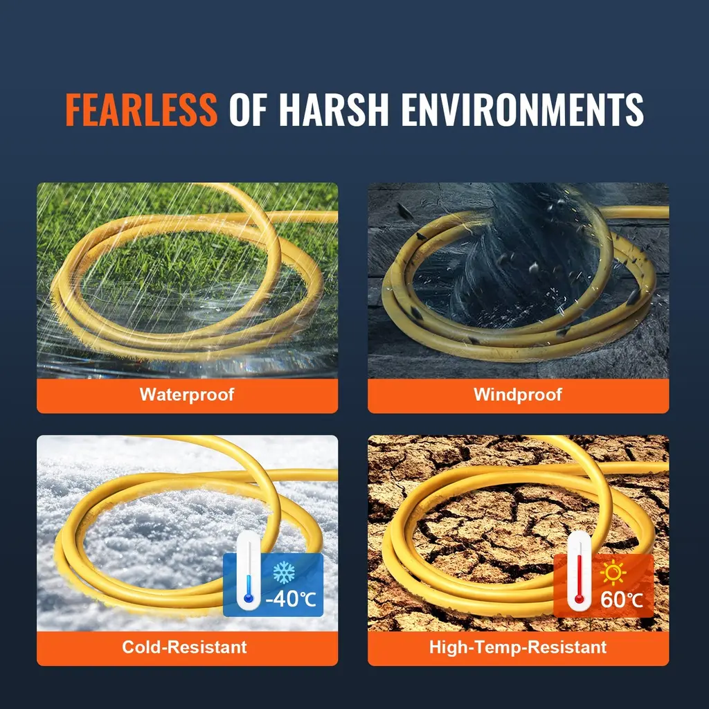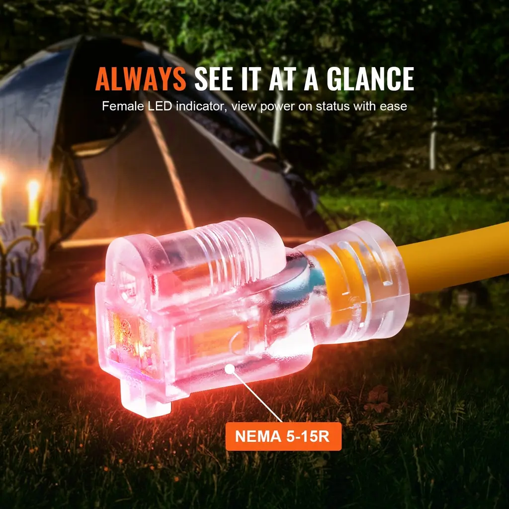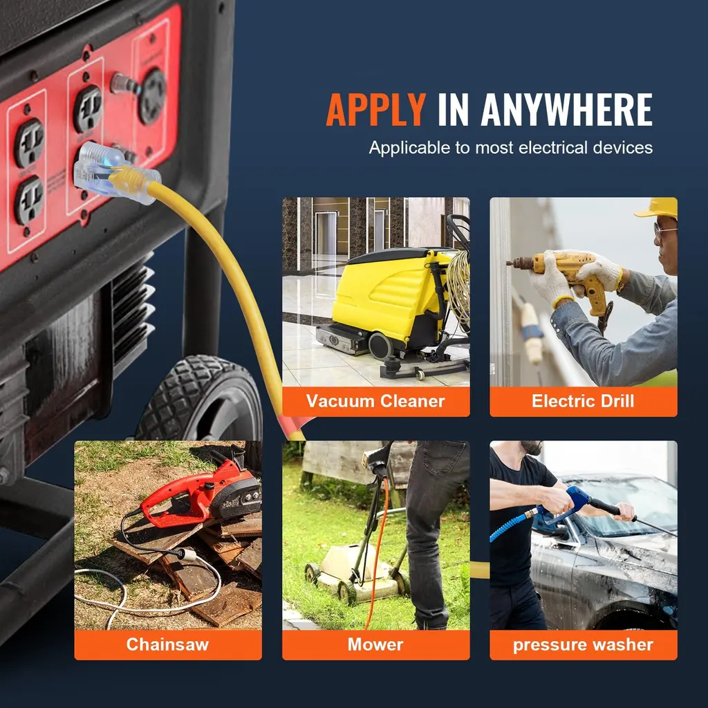 Max. Load 3750W / 1875W: Our generator extension cord supports loads up to 3750W(125V/30A) / 1875W (125V/15A). 100% all-copper cable conducts electricity faster and more consistently for heavy-duty power tools such as circular saws and grinders. Strong Weather Resistance: The 25-foot generator power cord is both functional and practical. The thickened PVC-wrapped surface is waterproof, wear-resistant, and can be exposed to sunlight for a long time. Remains flexible and works uninterrupted in extreme climates ranging from -40°C to 158°C. Clear LED Indicator(for yellow option): The female end of the heavy-duty generator extension cord is equipped with an LED indicator to show the power on condition at a glance. The eye-catching yellow color makes it easy to find even at night, significantly reducing the risk of touching in the dark. No Power Disconnection(gor black option): The male end of the heavy-duty generator extension cord is designed with a twist lock structure that allows the extension cord to be securely connected to the power supply, avoiding abrupt power disconnection caused by tripping over the cord. Security Comes First: You can use this SJTW generator electric cord with confidence. The generator cable has passed the bending test and 2500V high voltage test before shipment to ensure you can use it securely after receiving it. Designed for Generators: For 3750W yellow option: The 25-foot long heavy duty outdoor extension cord with one 30A NEMA L5-30P male plug and three 15A NEMA 5-15R female plugs provide you with a more convenient power supply over long distances, whether for home or outdoor use. For 3750W black option: The 25-foot long heavy duty outdoor extension cord with one 30A NEMA L14-30P male plug and four 20A NEMA 5-20R female plugs provide you with a more convenient power supply over long distances, whether for home or outdoor use. For 1875W option: The 25-foot long heavy duty outdoor extension cord with 15A NEMA 5-15P male plug and 15A NEMA 5-15R female plug provides you with a more convenient power supply over long distances, whether for home or outdoor use.