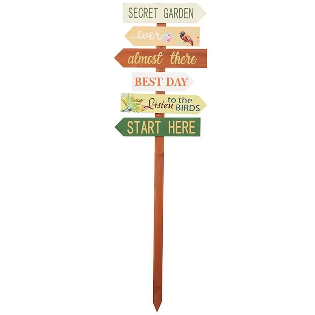 Set your yard apart from the others on your street with this Secret Garden Directional Stake. The decorative stake features multiple signs pointing in different directions. They read "Secret Garden", "Start Here", "Best Day", "Ever", "Listen to the Birds" and "Almost There." No assembly needed; arrives ready to use.