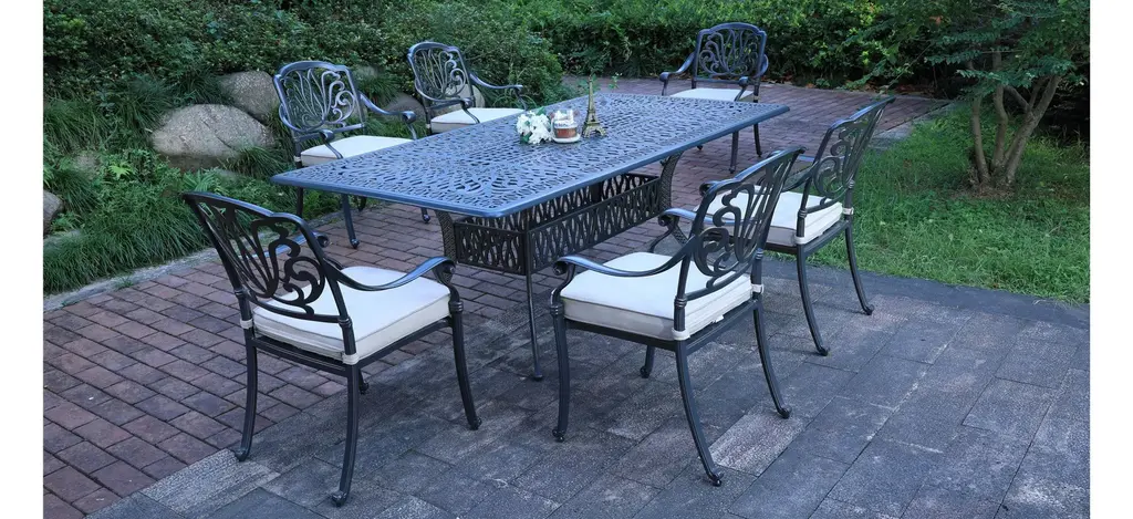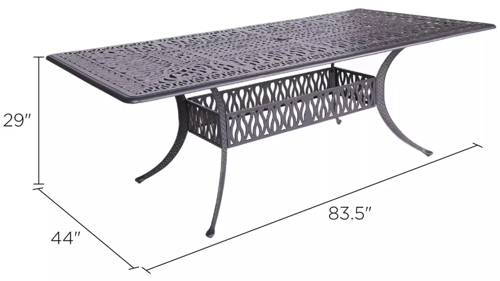 If you use our modern design Geneva outdoor rectangle dining table, you will be in love with this beautiful creation. This handsome piece is constructed from a heavy duty cast aluminum, finished with weather-resistant powder coating. This rectangle dining table will make a unique addition to your dining space. The rectangle table is solid, durable and beautiful. This aluminum frame offers more strength and stability to the table.