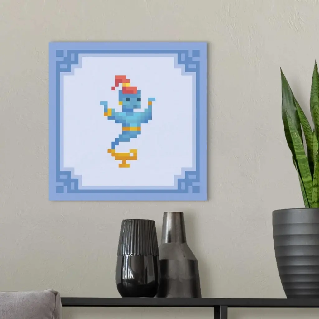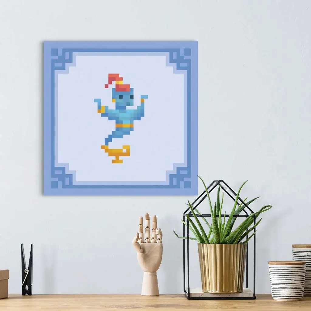 Genie appear from magic lamp. Pixel art character. Originally a vector illustration in 8 bit style.