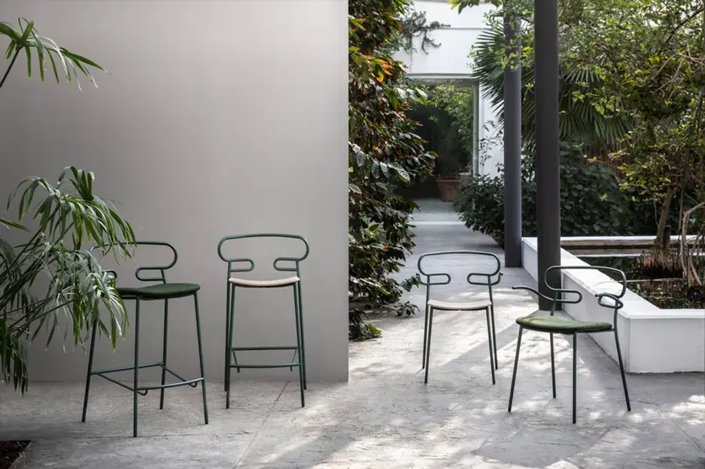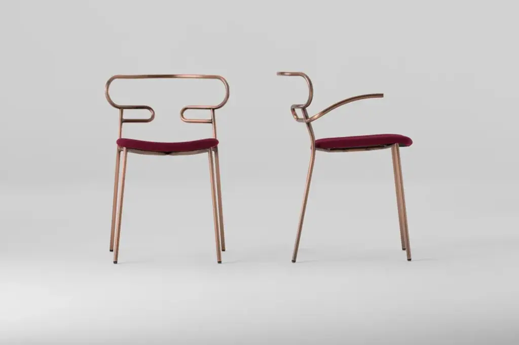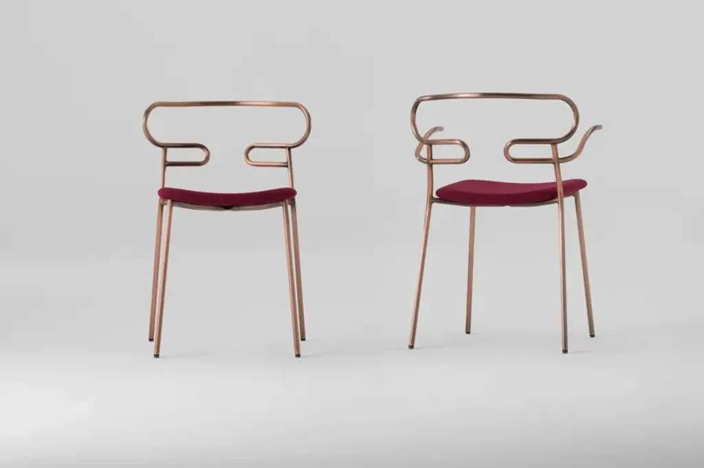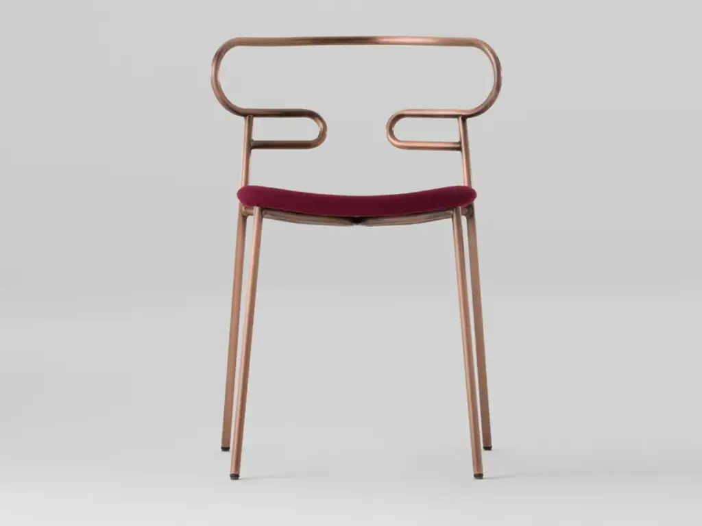 Chair for living, restaurant, bar, hotel, house. Metal base lacquered and upholstery seat and arms.