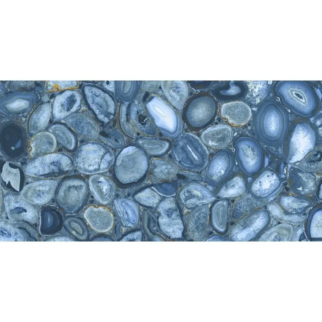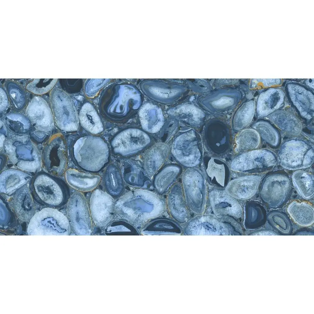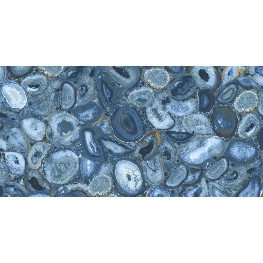 The Geode collection showcases exceptional craftsmanship, with large-format porcelain tiles featuring detailed geode patterns. Subtle blue tones swirl across the surface, offering a calming yet striking contrast, while fine gold accents outline each geode, adding an element of understated elegance. This collection brings depth, uniqueness, and a touch of refined sophistication to any environment, making it a timeless and captivating focal point for contemporary interiors. FEATURES: Stone-look design featuring geode patterns with blue and gold accents Rectified edges for a seamless installation Polished finish with a sleek surface 24" x 48" large format size Made in Italy from durable porcelain A case of this product includes 2 pieces and covers 15.5 square feet Porcelain, singular, large format, rectangle, polished, stone look, rectified floor and wall tile Impervious and waterproof; Not suitable for outdoor use but are resistant to most elements Polished finish with a V4 substantial variation Ideal for bathrooms, showers, kitchens, floors, walls Approved for residential and commercial installations Easy to install 24 inches x 48 inches decorative porcelain tile This product has a PEI rating of 2 ([endurance] and hardness indicator), and therefore is suited for walls and light-traffic floors DIMENSIONS: Individual tile size: 24 inches L x 48 inches W Surface area per carton: 15.5 square feet Pieces per carton: 2 pieces Sample tile size: 4 inches L x 4 inches W