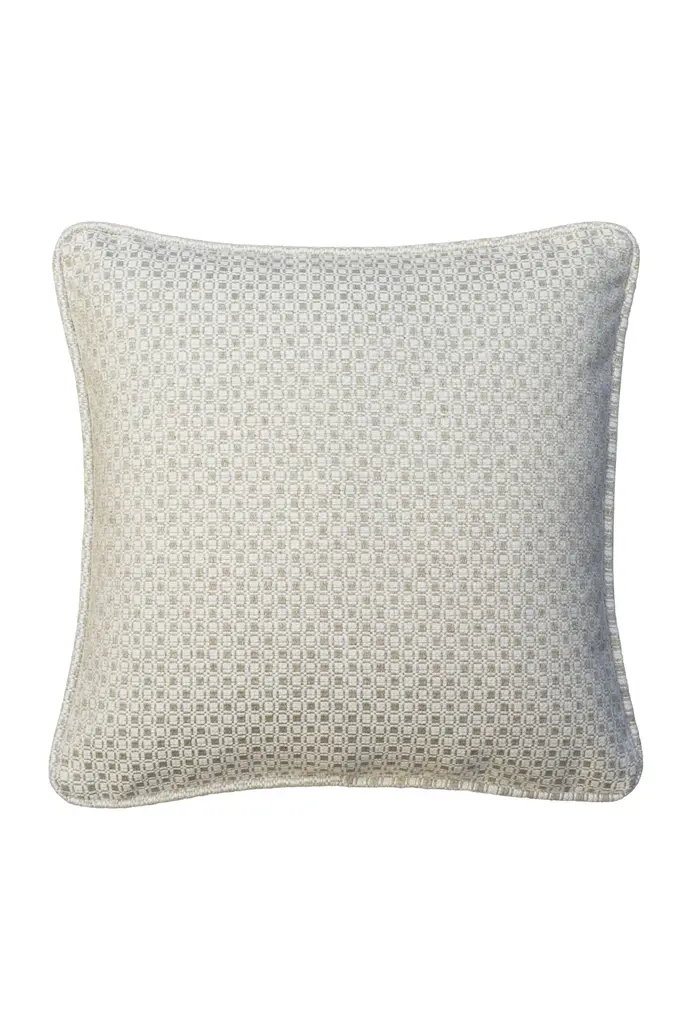 This interlocking geometric pattern in a golden almond color, beautiful pearly neutral shade, and cool gray tone of Andrew Martin Monte has a slight metallic sheen and has been paired with plain cream piping for a sophisticated edge. Pair with other cushions from the Brindisi collection to incorporate some of southern Italy's rustic elegance into your own home.