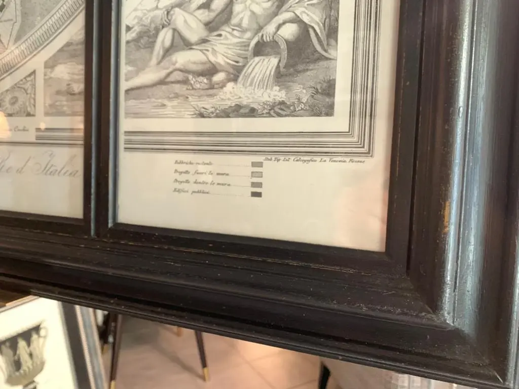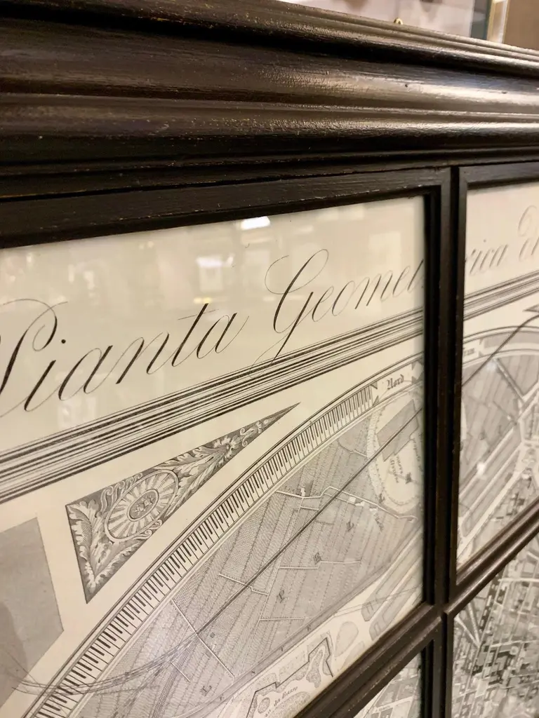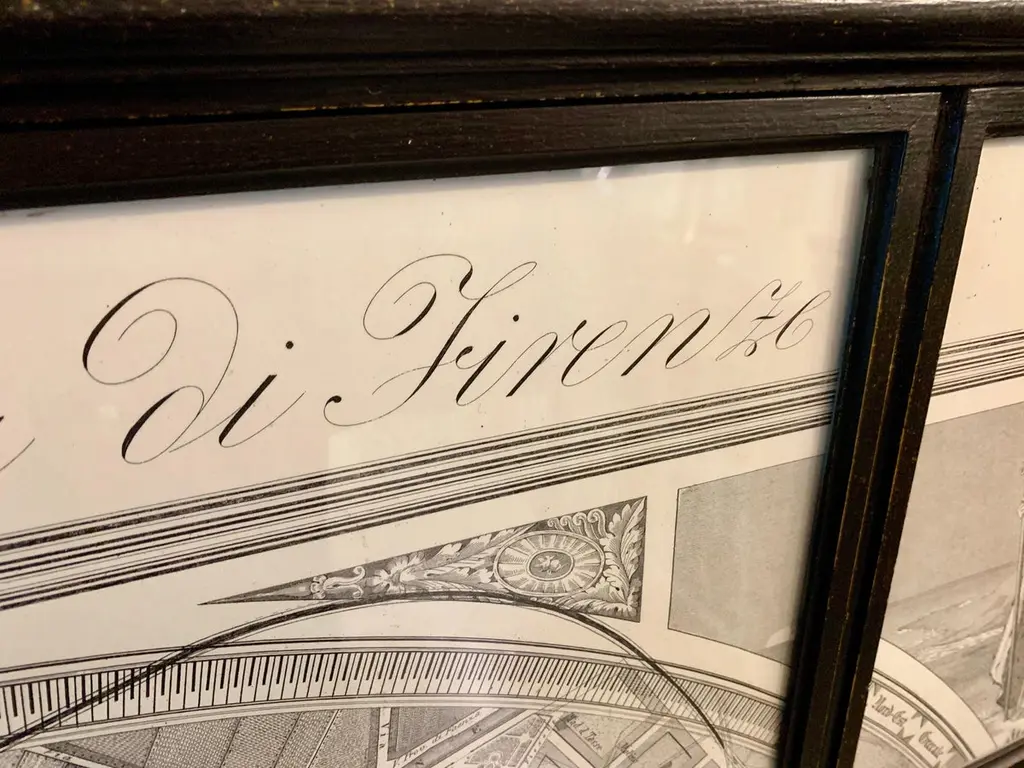 GEOMETRIC PLAN OF THE CITY OF FLORENCE WHICH IS TRUE AS 1:4.500, showing expansions and urban planning changes. The entire print, reproduced on paper, is framed with a "window" structure made of black lacquered and antiqued wood.With an experience of over 40 years, Artecornici design create high quality hand made frames using precious woods and working various types of high quality finishes, lacquers and aging, offering a vast choice of models.Each print is an artisanal Florentine product, reproducing images of the European eighteenth and nineteenth centuries with the same printing techniques (engraving with a star press), the golden age of prints, which are then finished and watercolored exclusively by hand The richness of our work lies in the ability to make our customers' requests our own, creating products with personalized, unique and precious creations, renewing our collections year after year.