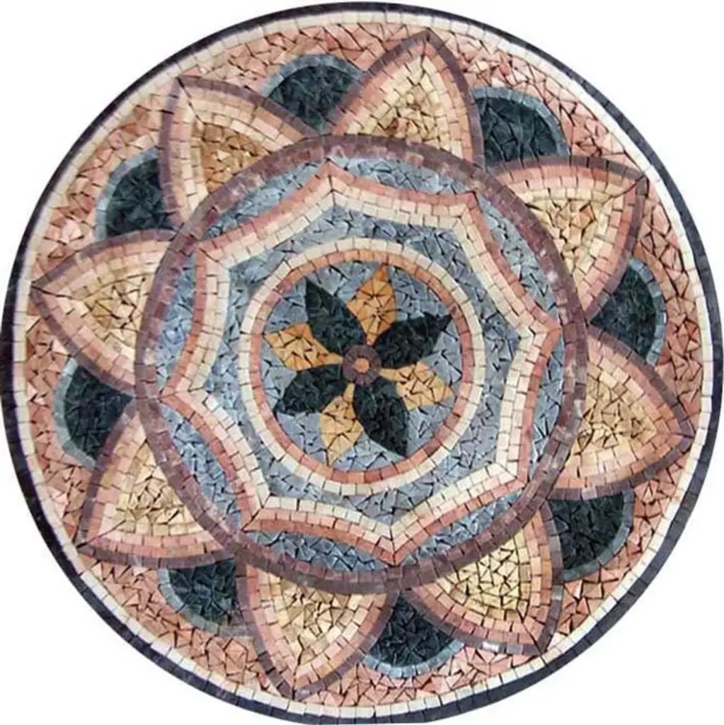 Our Durrah Green geometric mosaic pattern makes a lovely addition to your kitchen bath and beyond. This marble mosaic showcases a pleated green and black starflower center and red lilies in a field of green and black. Order from our 4 standard sizes or get your mosaic custom sized to meet your project requirements.