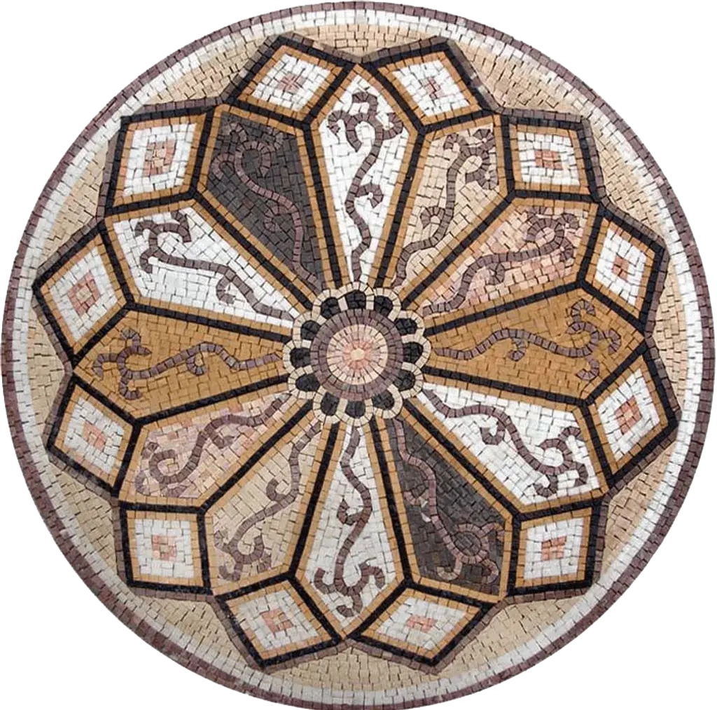 Our Durrah Ivory geometric mosaic pattern makes an impact as a kitchen backsplash countertop or decorative tile flooring. This medallion stone mosaic showcases a pleated starflower center and red lilies in red black and ivory/pink marble tiles. A mesh backing makes placement a breeze.