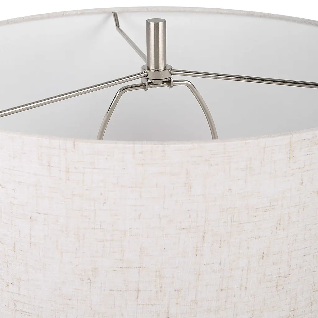 Illuminate your space with the modern elegance of this table lamp. Its geometrically carved base boasts a bleached wood tone, complemented by nickel-plated iron details for a contemporary touch. Paired with a casual oatmeal linen slubbed drum shade, this lamp adds warmth and style to any room. Product Features: Decorative table lamp Geometric carved base in bleached wood tone Casual oatmeal linen slubbed drum shade included Accented with nickel-plated iron details Convenient 3-way switch for easy operation Bulb base type: E26 Lamp uses (1) 150-watt bulb - not included For indoor use only Overall Dimensions: 30" high Shade dimensions: 11" high x 16" diameter Base dimensions: 5.25" diameter Material(s): resin/iron/linen