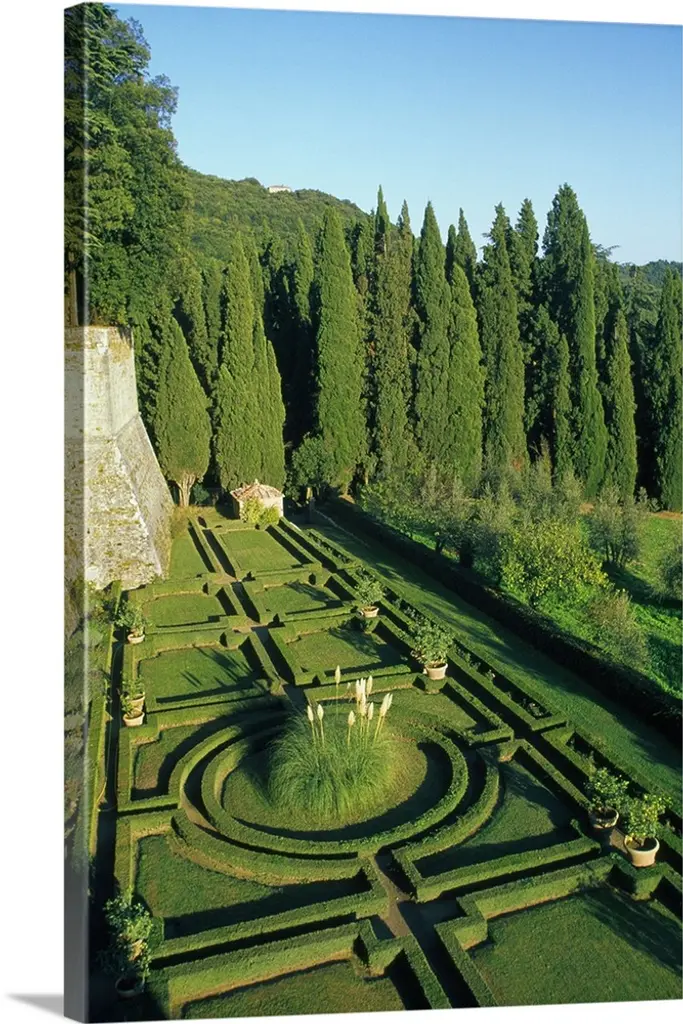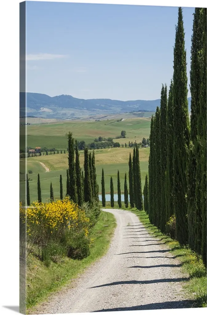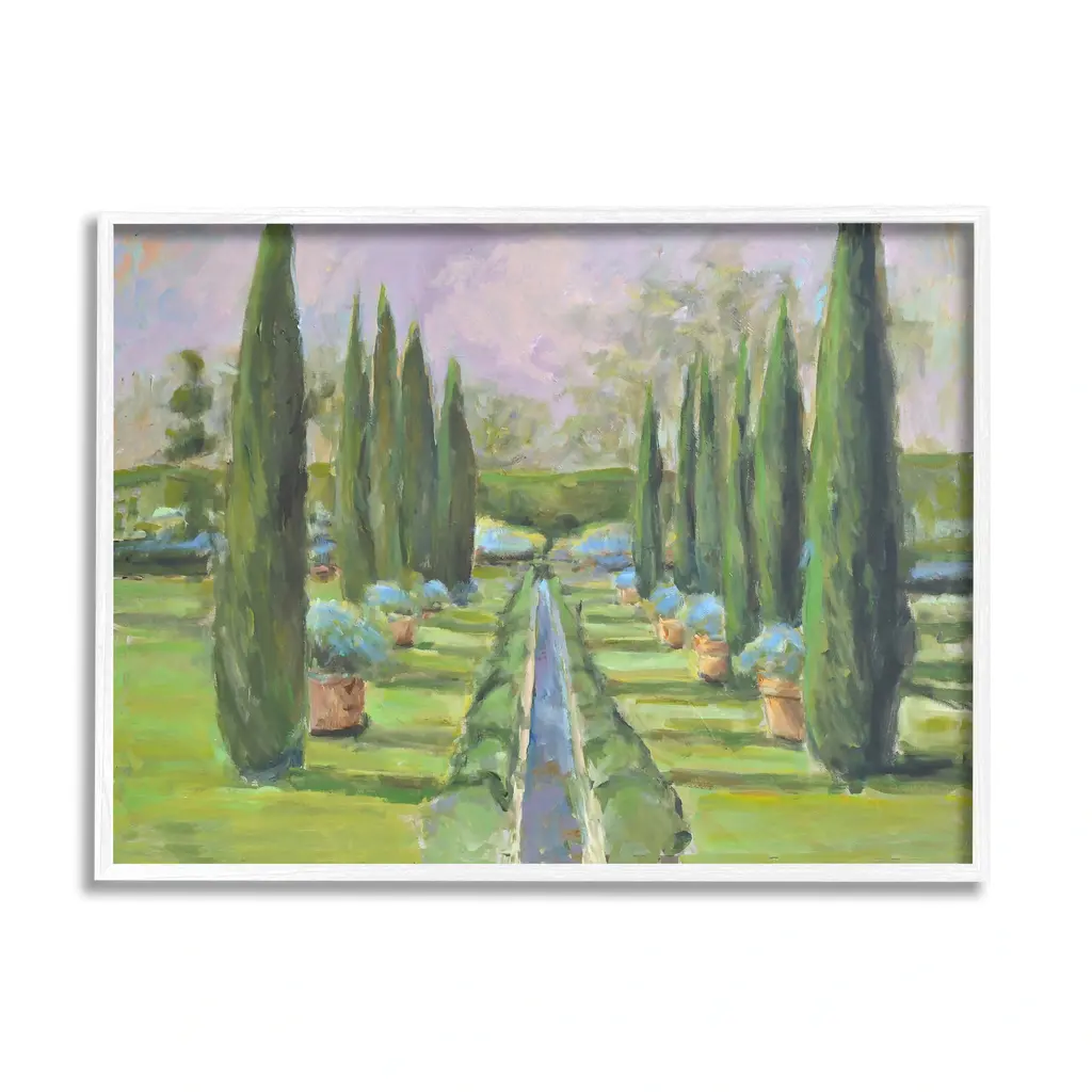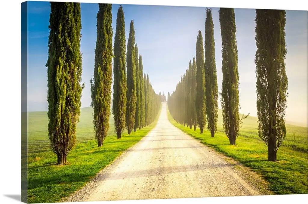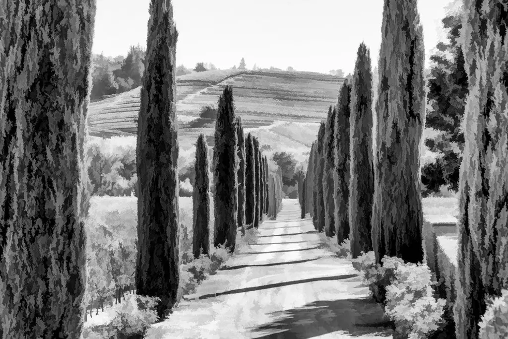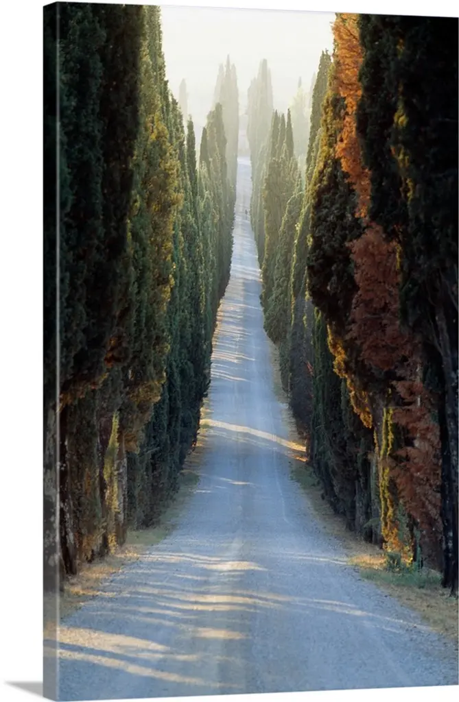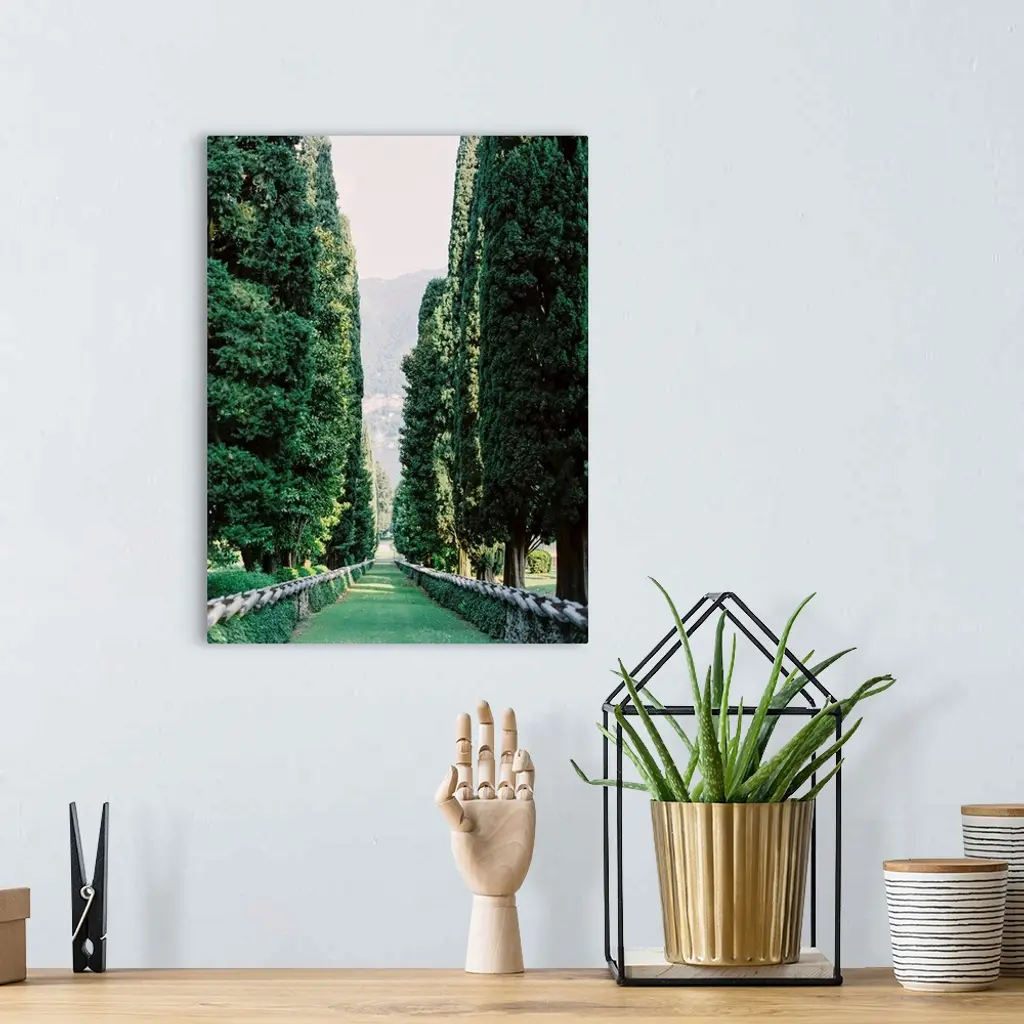 Photograph taken between an avenue of tall trees, Lake Como, Italy.