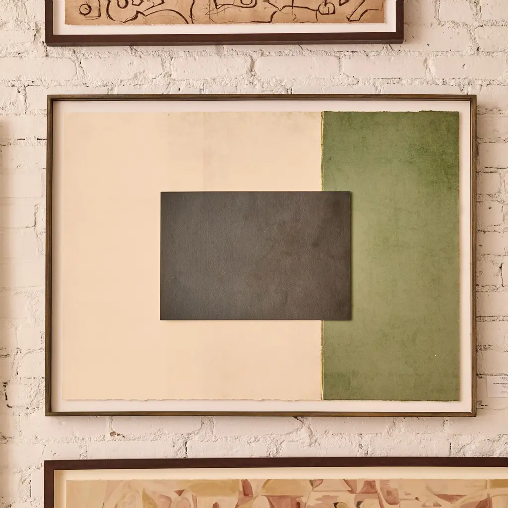Color blocks are artfully arranged. Framed in an antique gold wood with embossed weave pattern.