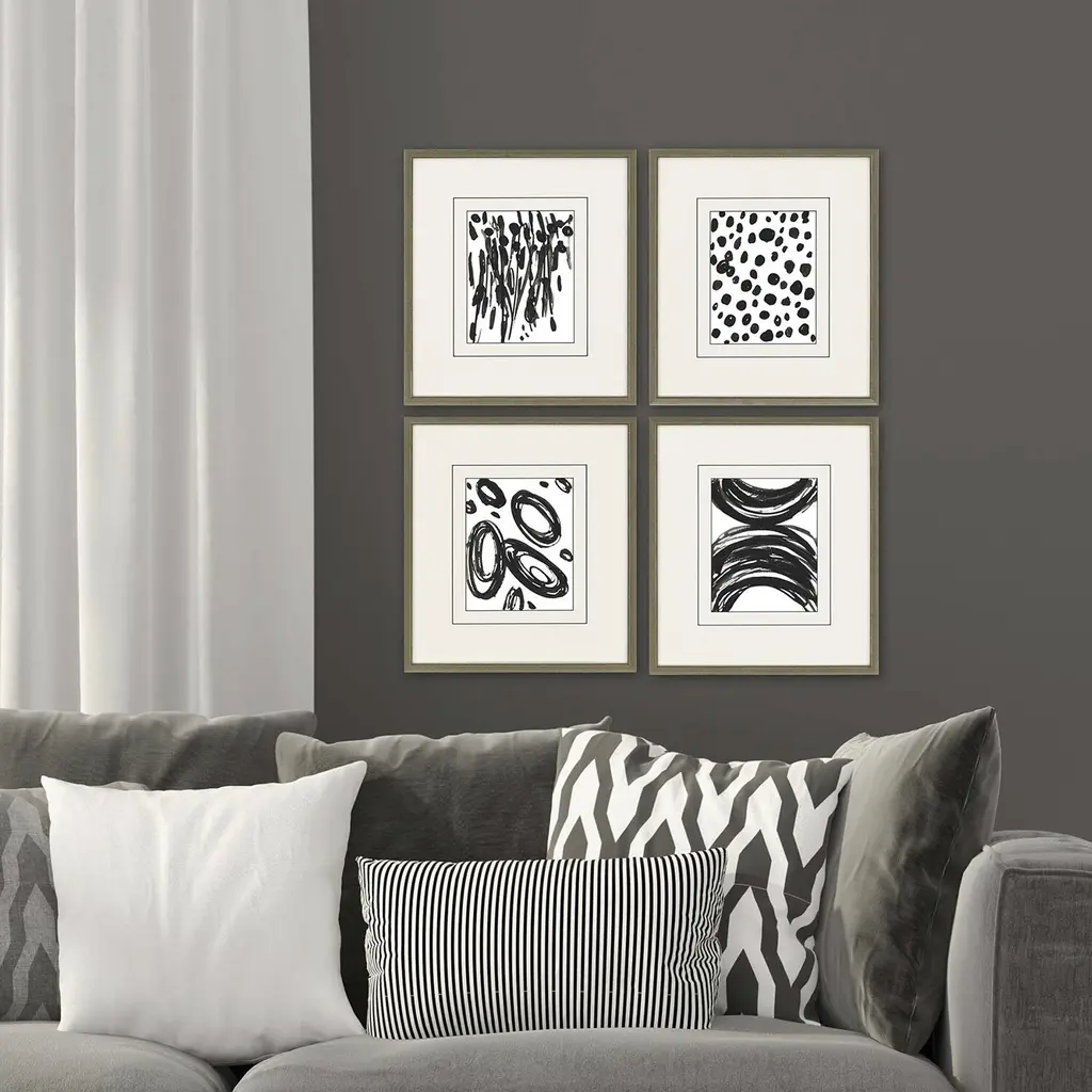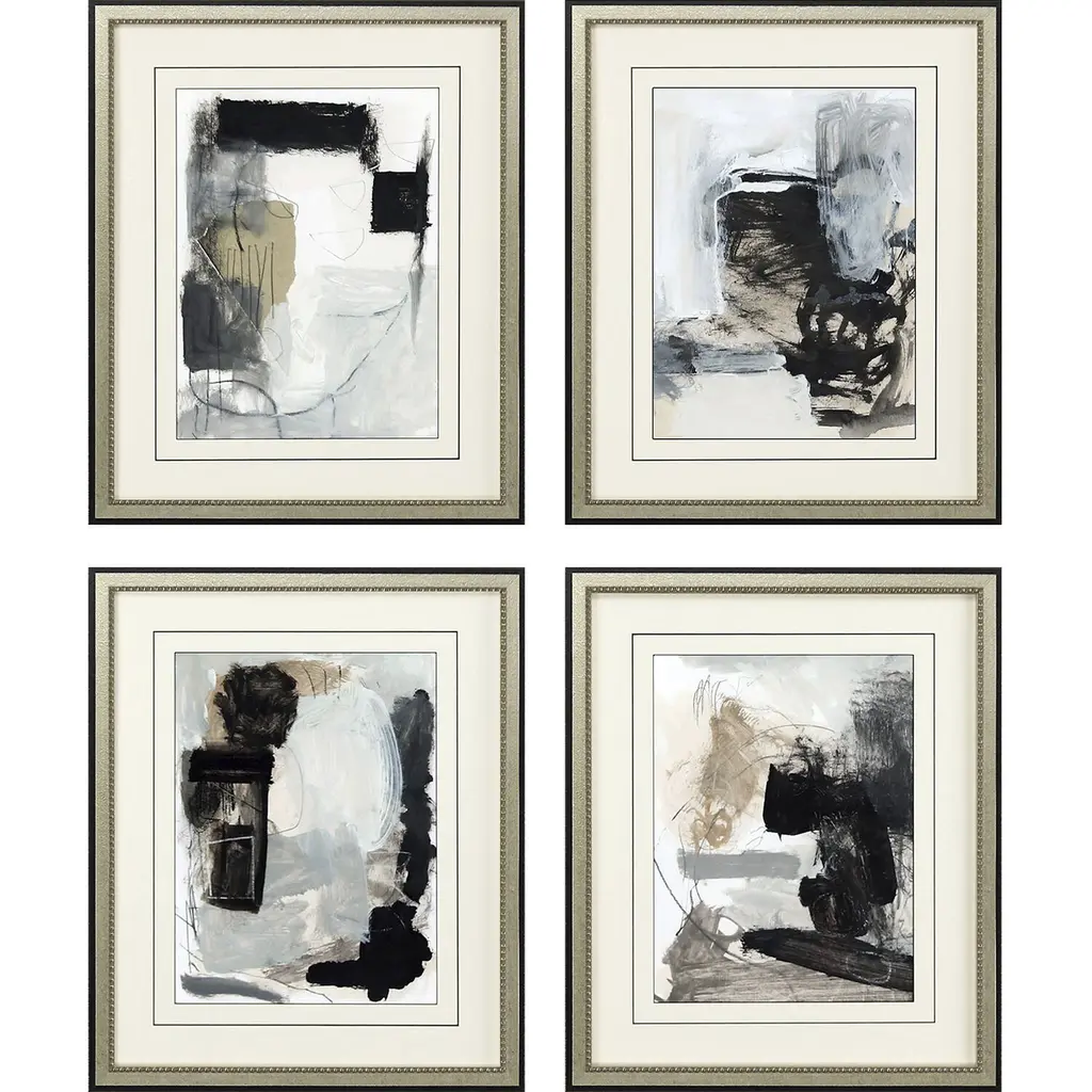 Black and white abstracts on fine art paper are matted in white. Framed in a sleek champagne gold wood.