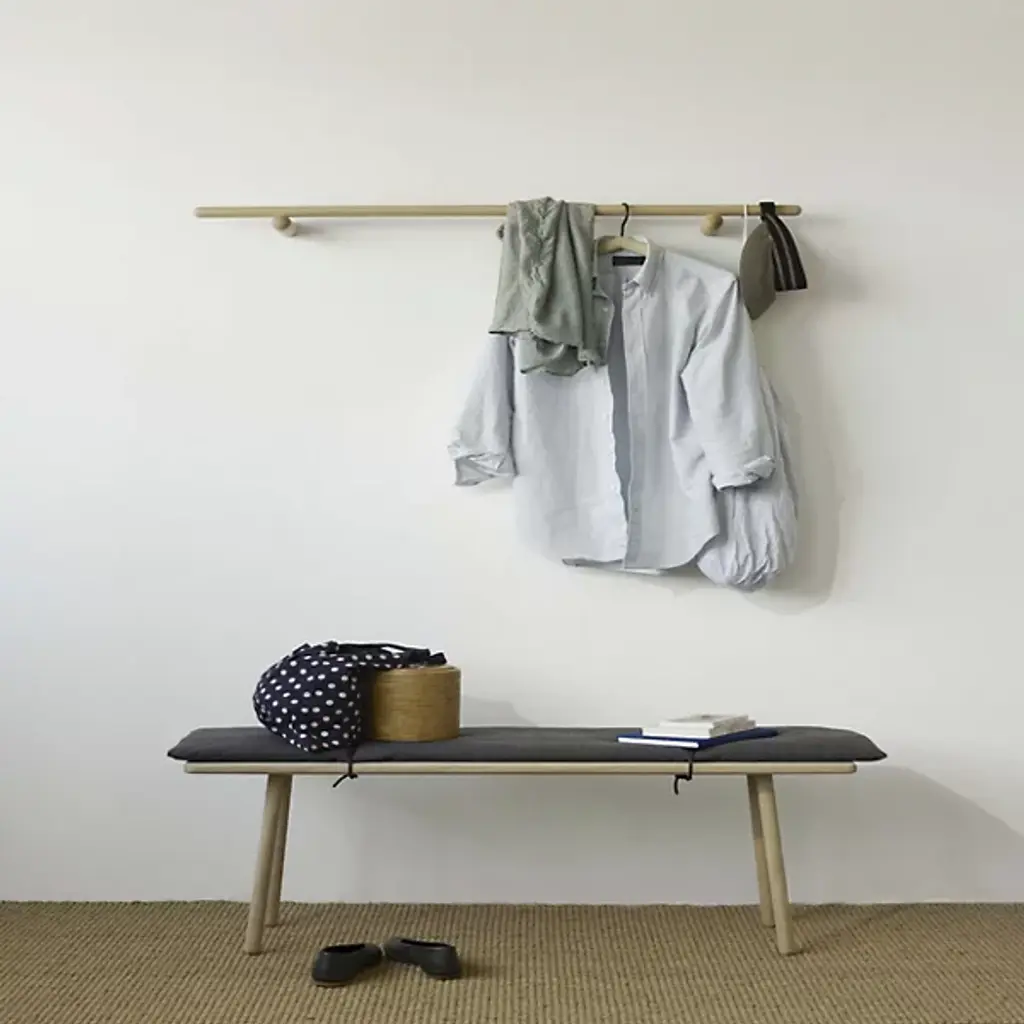 The Georg Rack 115 from Fritz Hansen, designed by Chris Liljenberg Halstrøm, is part of a collection blending Nordic warmth with Japanese minimalism. This simple yet elegant construction offers functional storage with a minimalist charm, featuring two short poles and one long. Made from FSC-certified oak, this rack is a stylish and practical addition to any space, perfect for hanging clothes or accessories.