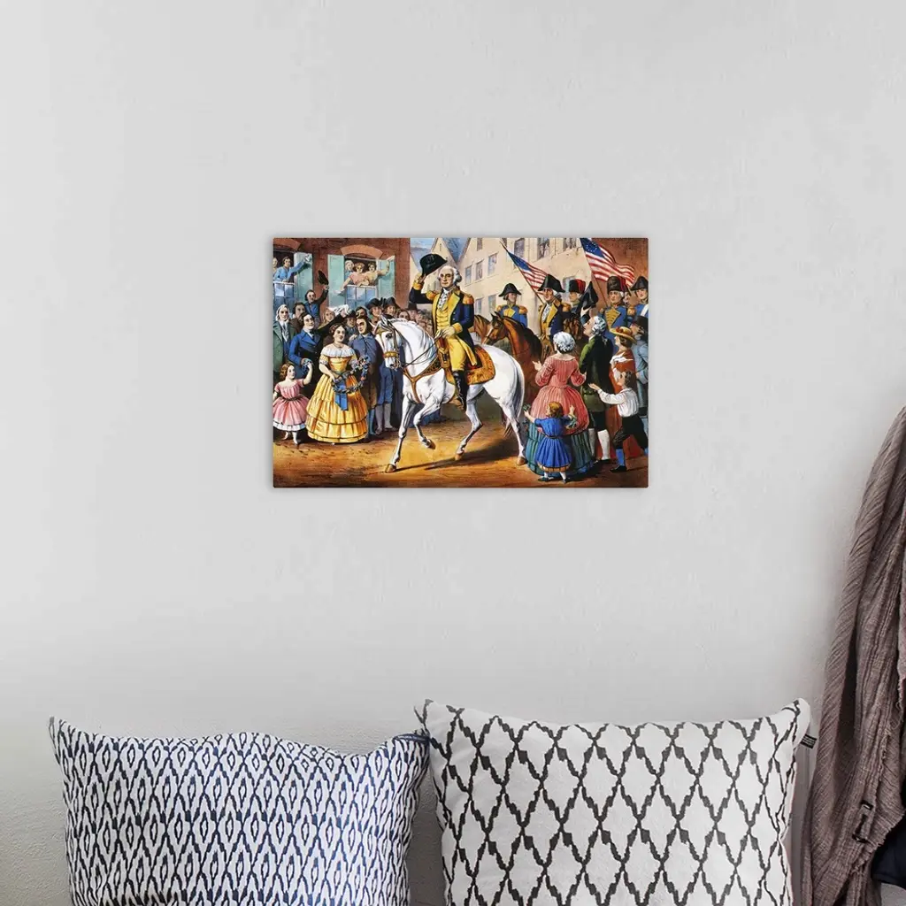 (1732-1799). George Washington's entry into New York on the evacuation of the city by the British on 25 November 1783. Lithograph,1857, by Currier