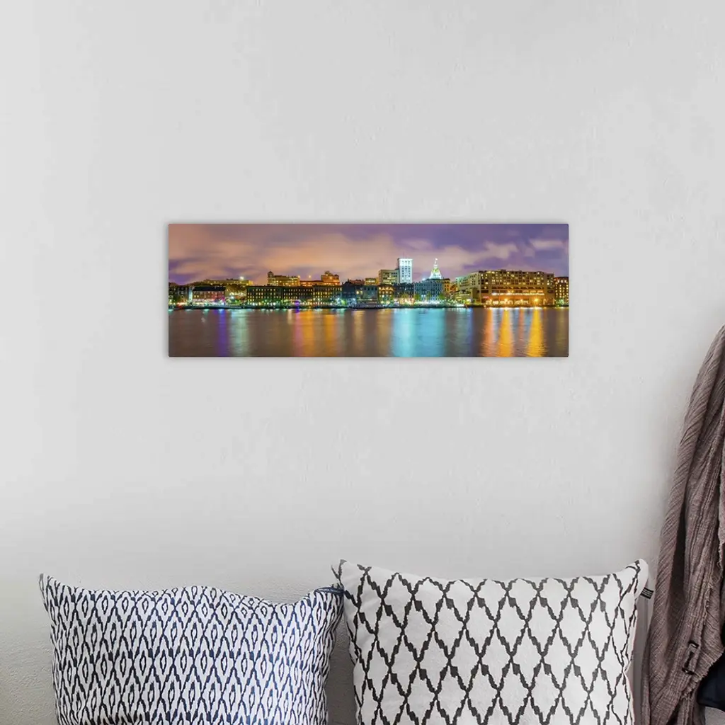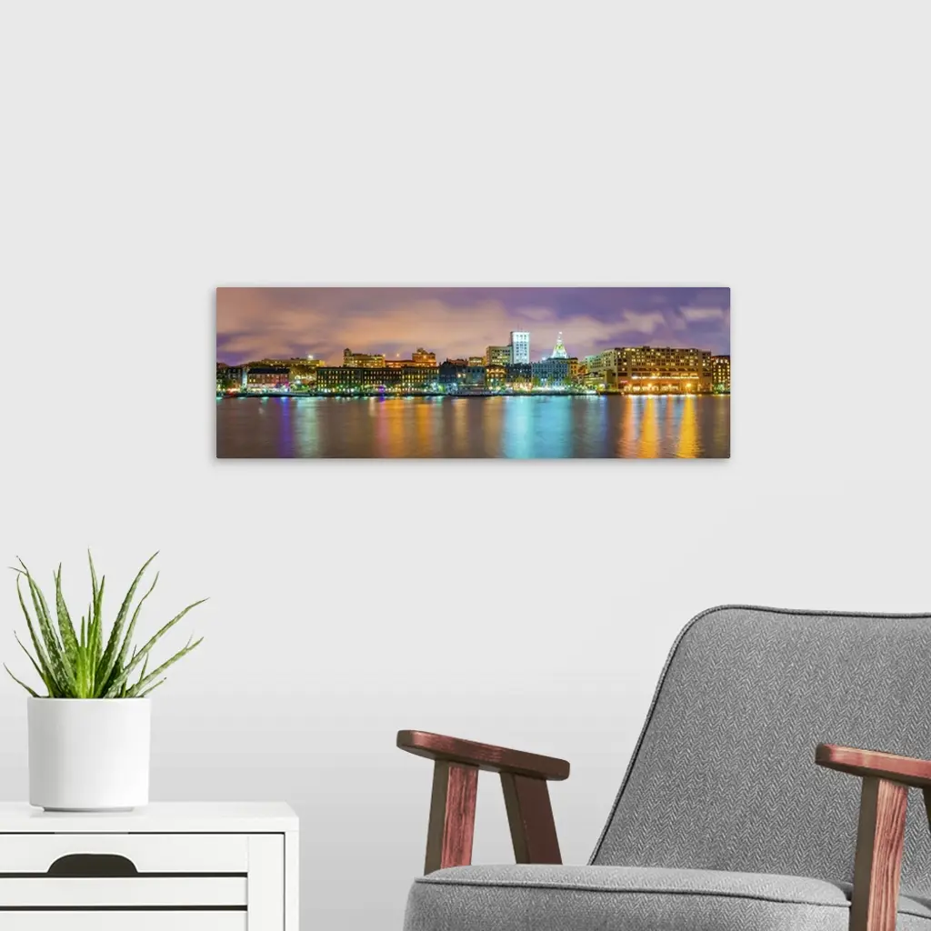 USA, Georgia, Savannah, Skyline reflected in the Savannah river.