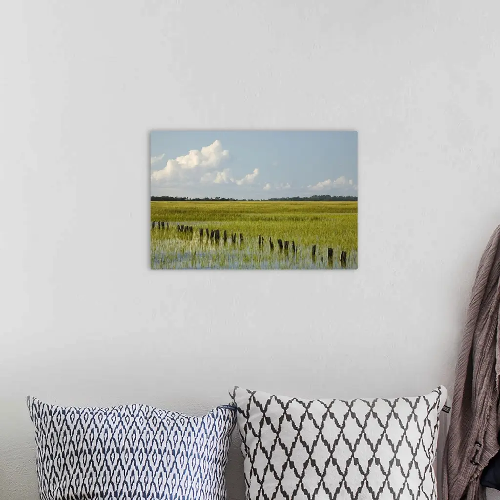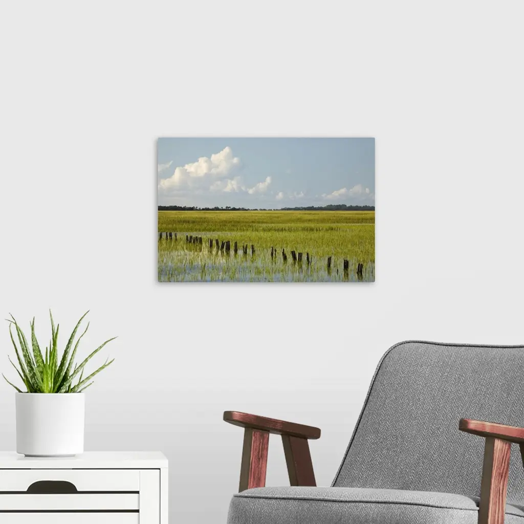 USA, Georgia, Savannah, Tidal marsh with pilings.