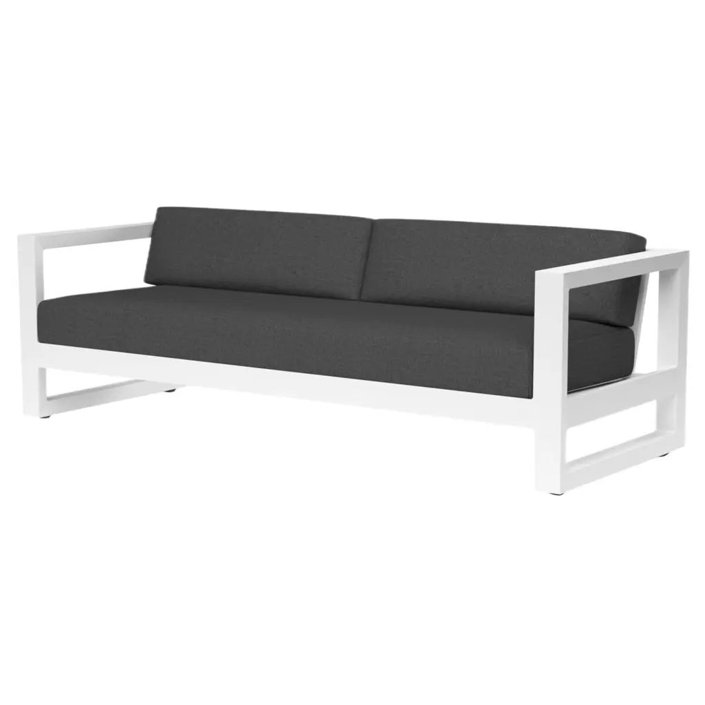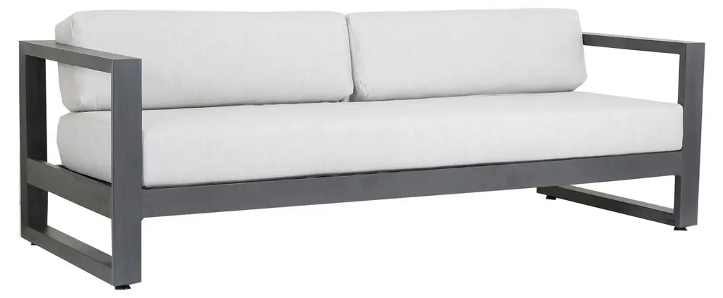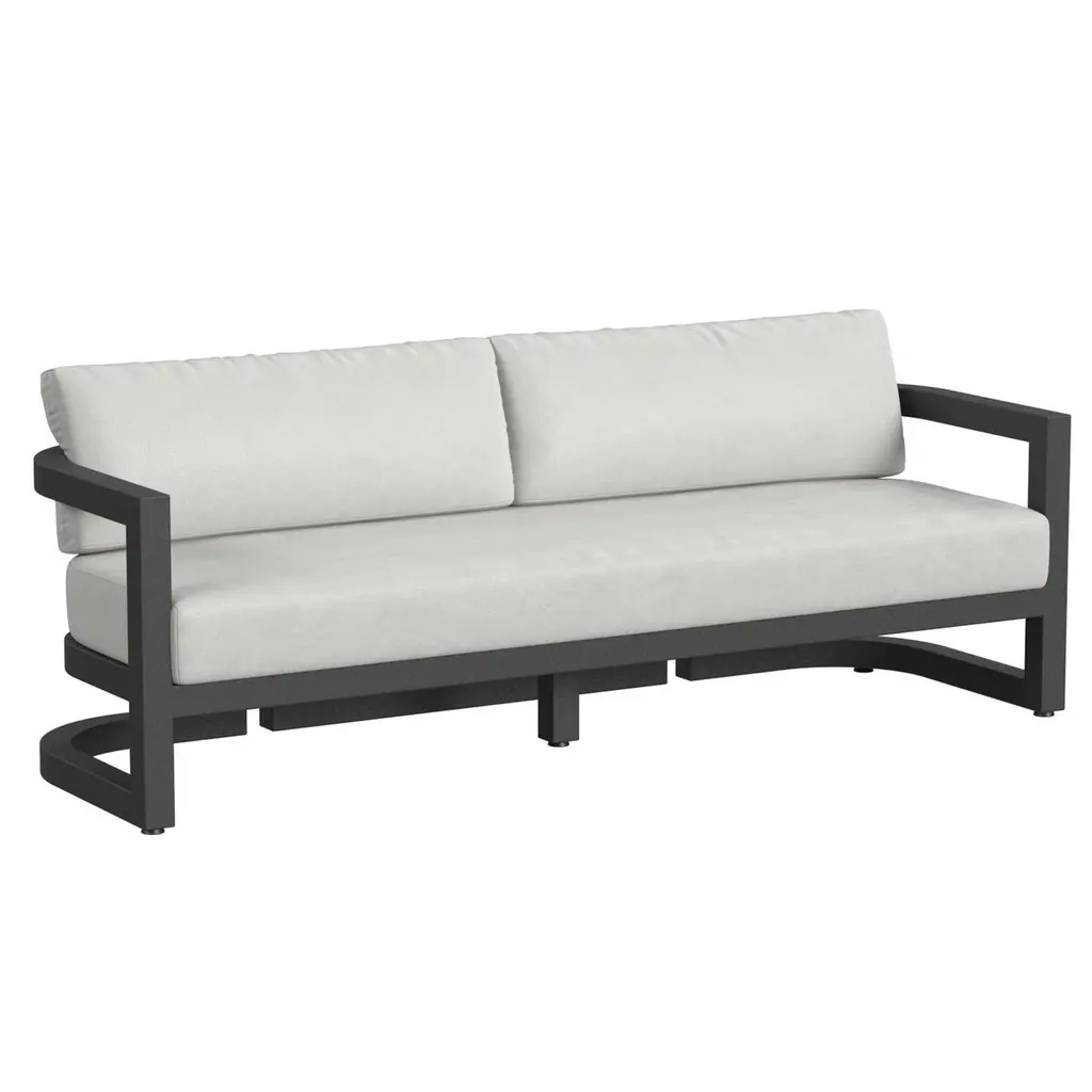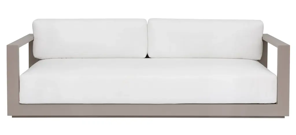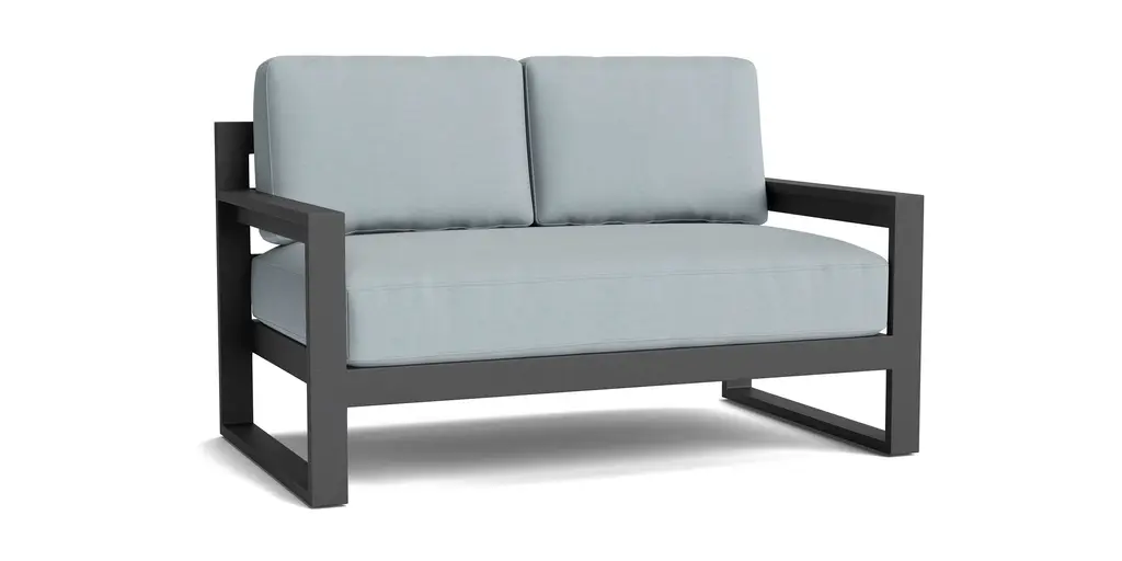 This sofa is a distinct, open silhouette, and sleek, angular lines are thoughtfully complemented with detail such as beveled extrusion edges and subtle soft curves. Crafted with the highest quality comfort and durability, it will stand the test of time with minimal maintenance. Its powder-coated aluminum frame is finished in a polished burnished slate, it's base is protected by resin feet. Weather-resistant, high-resilient density cushions are enveloped in quick-ship fabric Sunbrella.