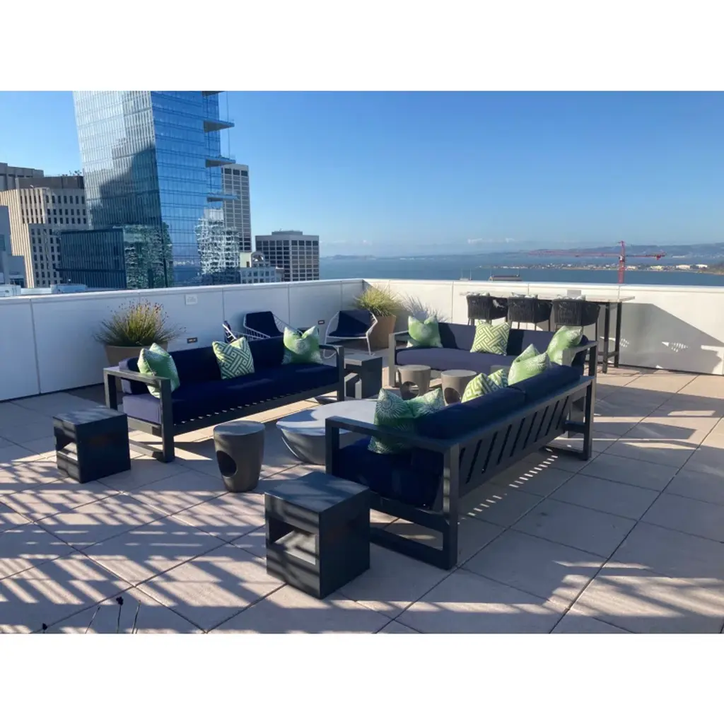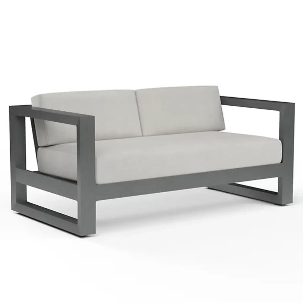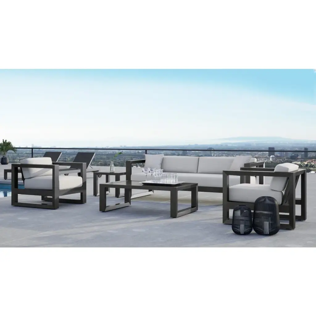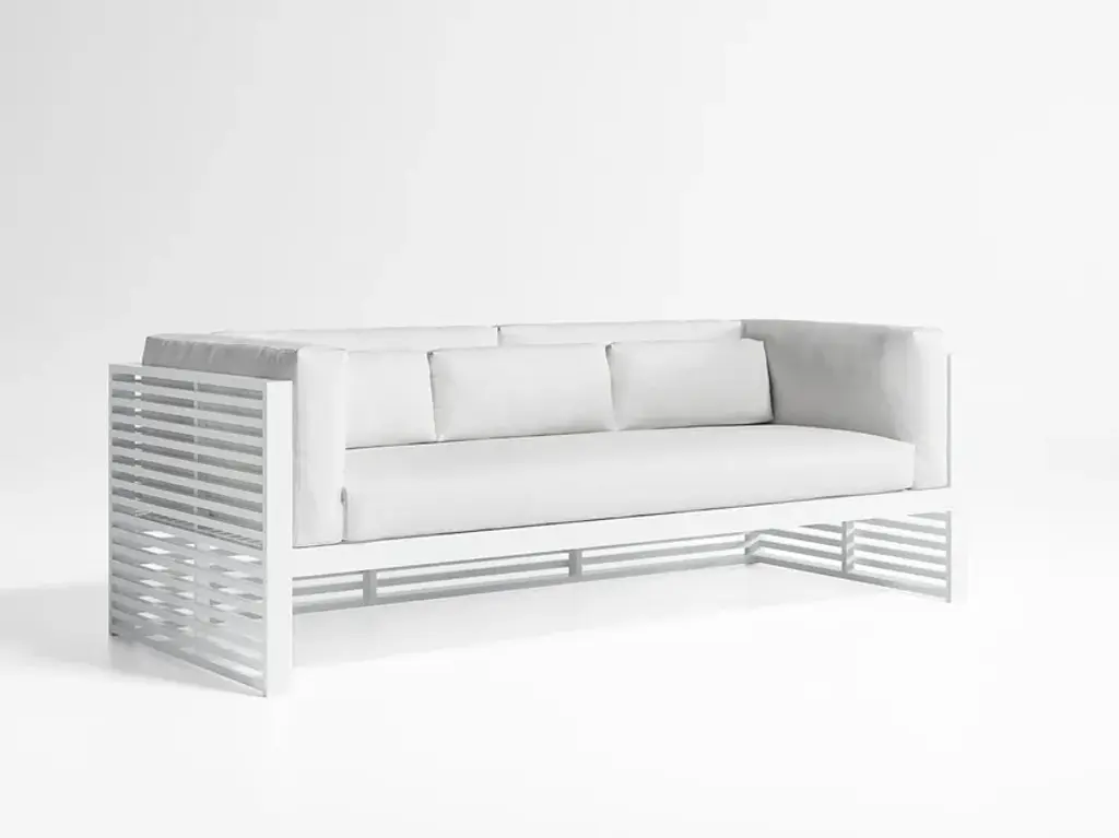 This sofa is a distinct, open silhouette, and sleek, angular lines are thoughtfully complemented with detail such as beveled extrusion edges and subtle soft curves. Crafted with the highest quality comfort and durability, it will stand the test of time with minimal maintenance. Its powder-coated aluminum frame is finished in a polished burnished slate, it's base is protected by resin feet. Weather-resistant, high-resilient density cushions are enveloped in quick-ship fabric Sunbrella.