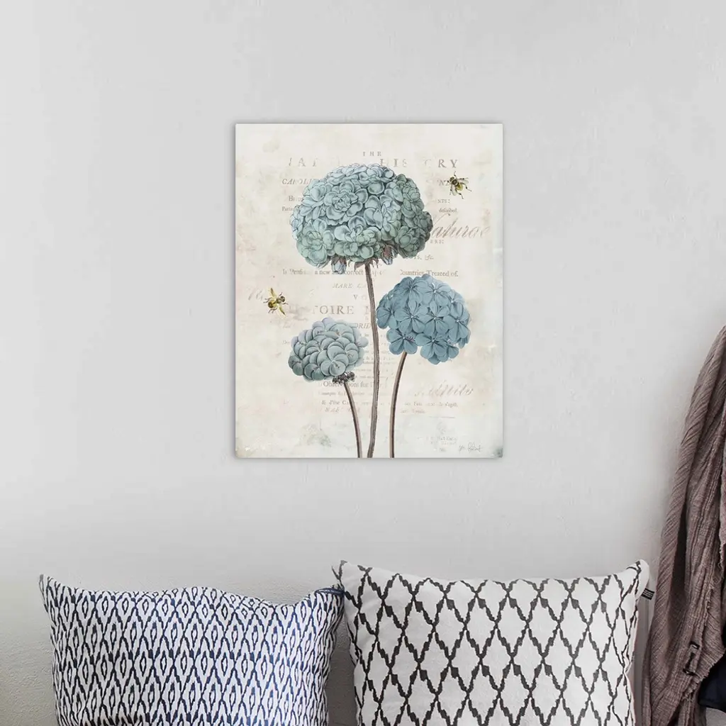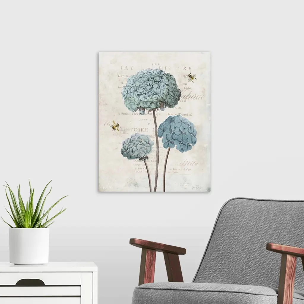 Vintage illustration of blue geraniums and bumble bees with faded text on the background.