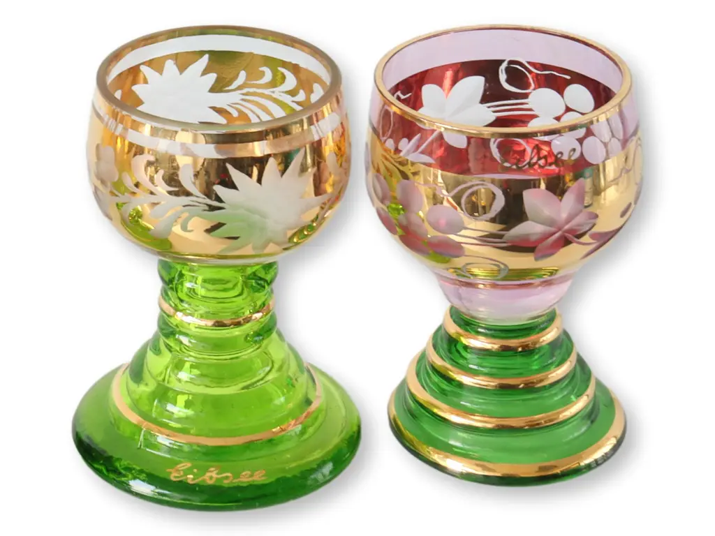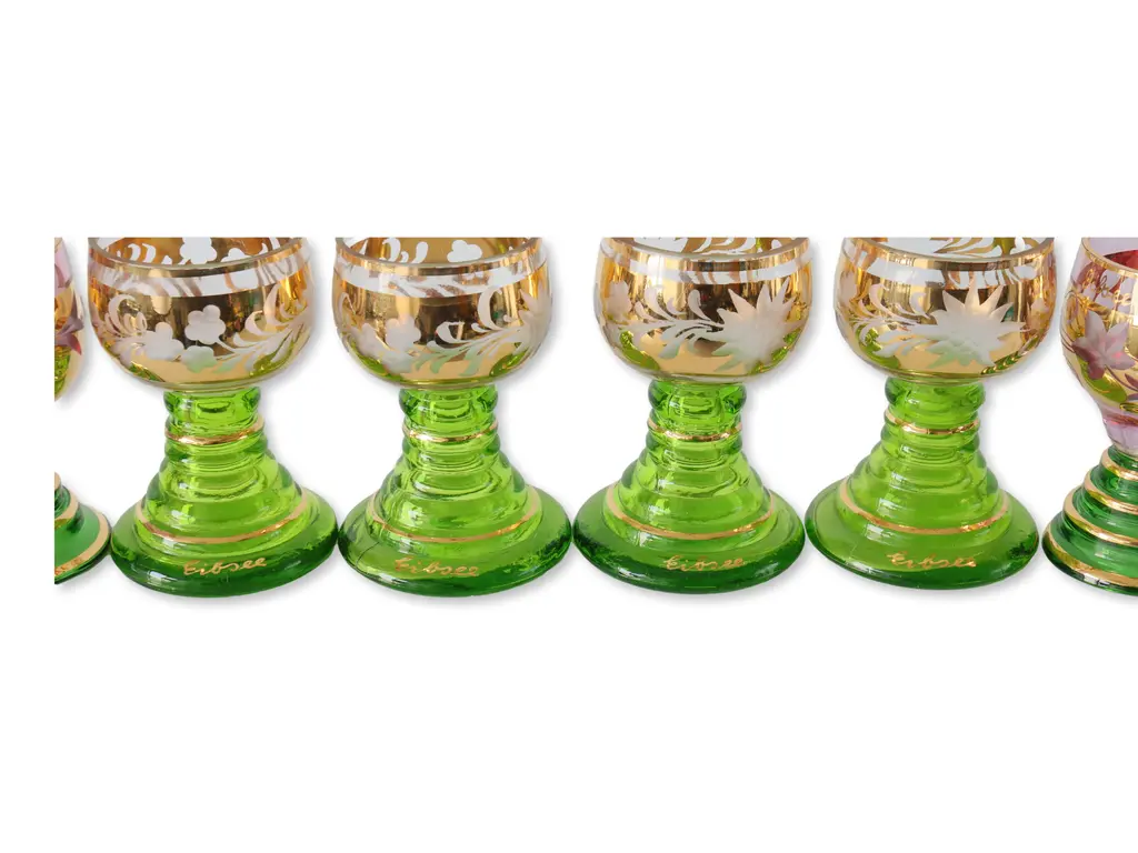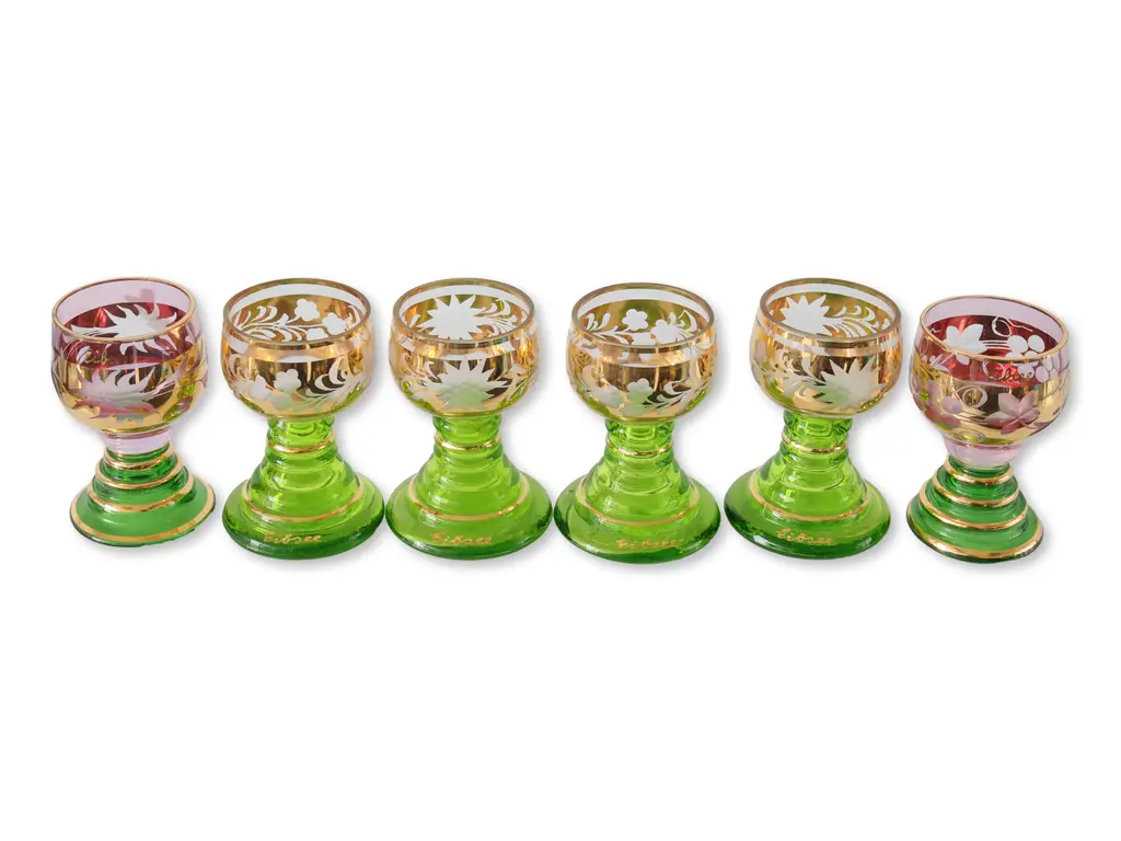Set of six cordial glasses with beehive bases and grapevine motif. Four green and two red cut to clear. Maker's mark on base of green/gold glasses.