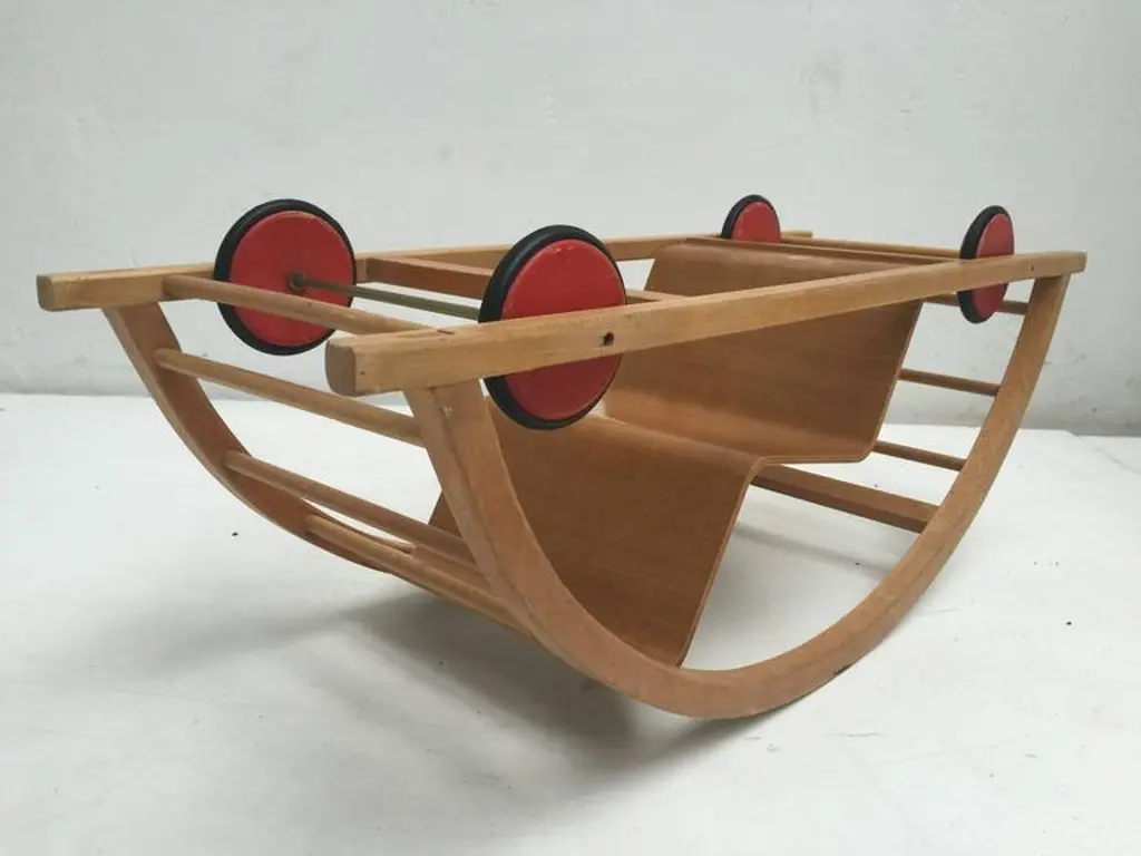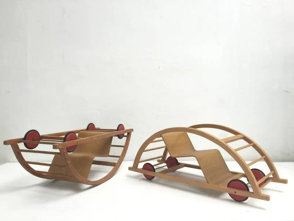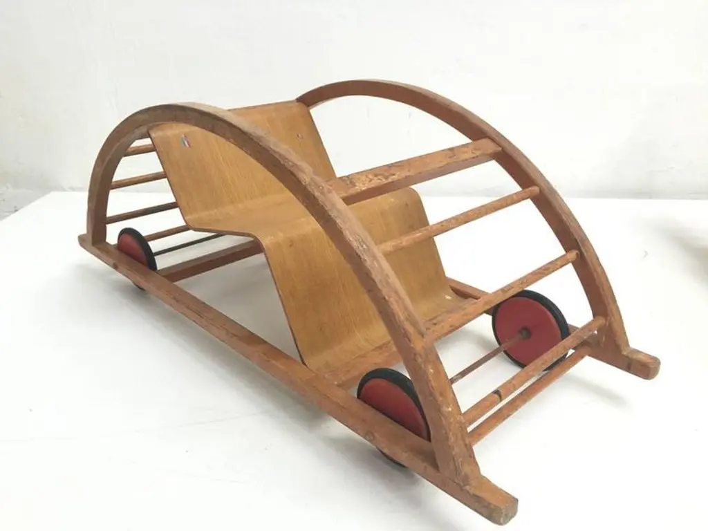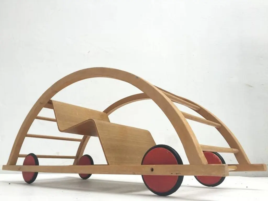 This ingenious design for children is from German (DDR) designers Hans Brockhage and Erwin Andra made in the early 1950'sHans Brockhage (1925-2009) was wounded in WWII and started a study as sculptor in 1945 in Dresden were he got educated by important Dutch designer Mart Stam Erwin Andrä (1921) started as a model builder and was also educated in Dresden where he became a teacher after WWIIIn the 1960's he became director at the institute for toys Sonneberg and later rector at the school for industrial designThe Schaukelwagen is fine example of how 3 designers with each their own perspectives worked together in the DDR resulting in this design classic for kids