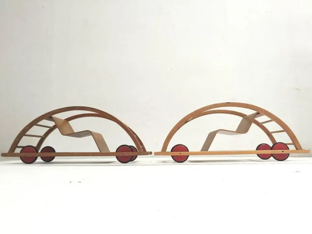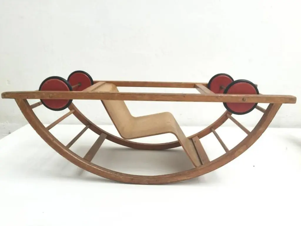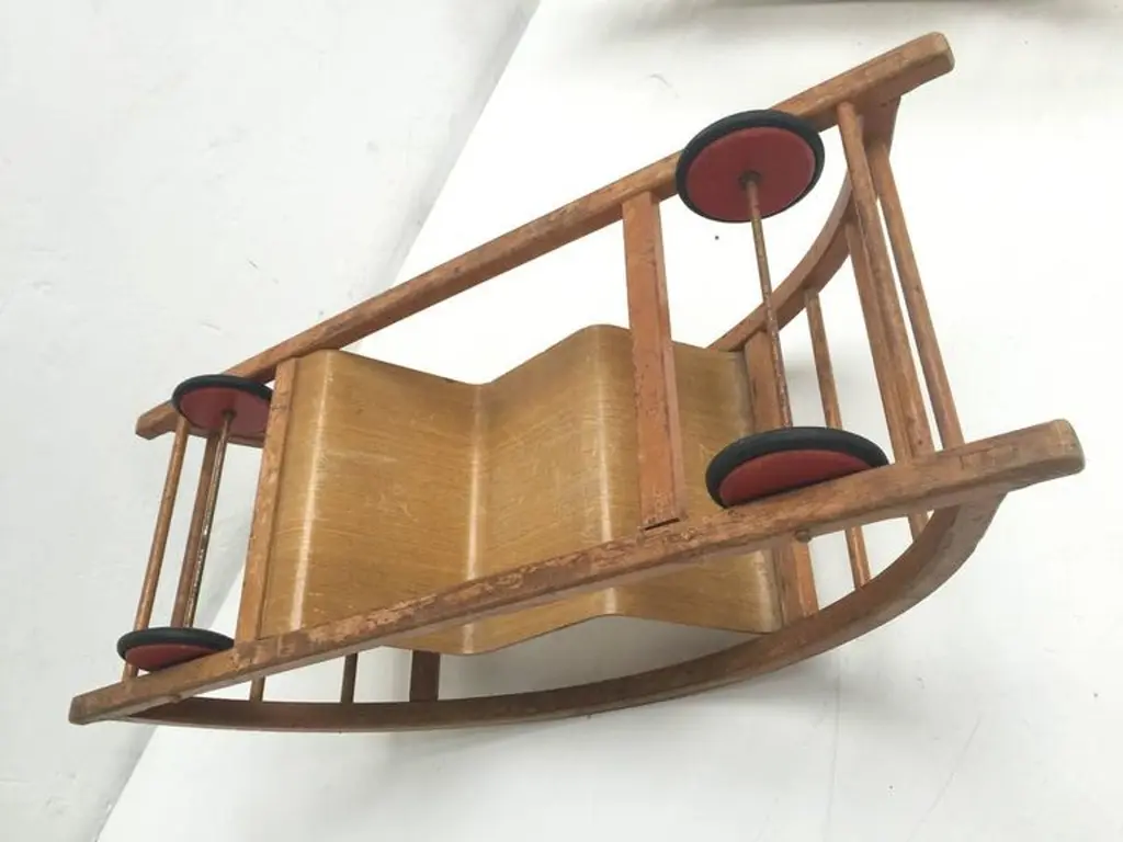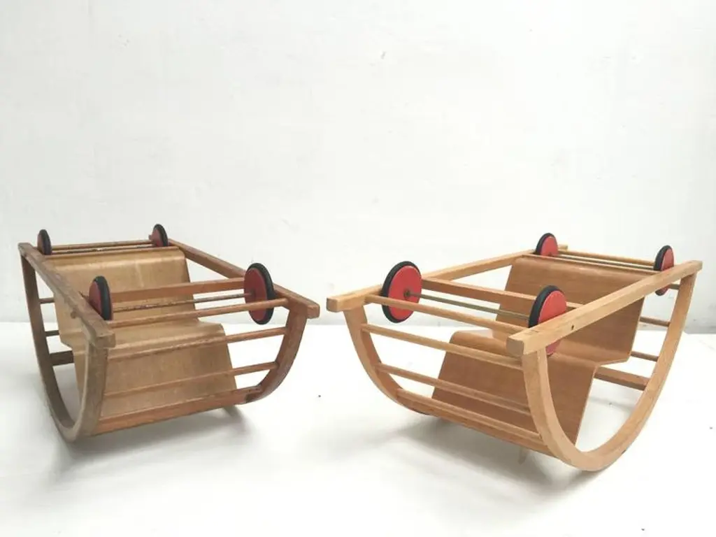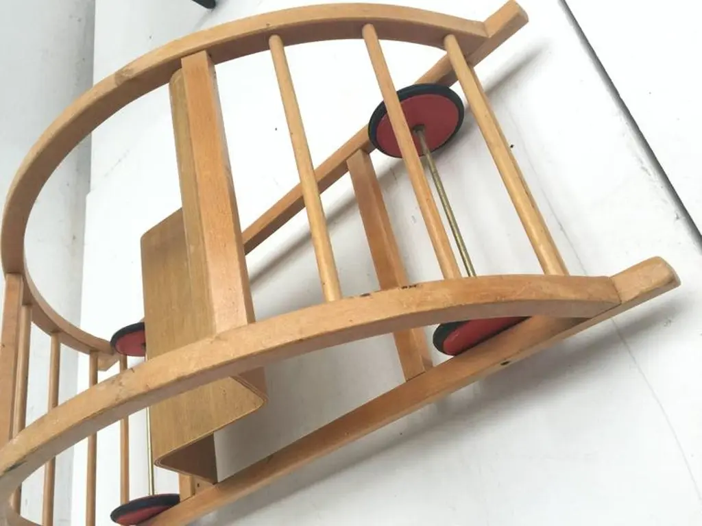 This ingenious design for children is from German (DDR) designers Hans Brockhage and Erwin Andra made in the early 1950'sHans Brockhage (1925-2009) was wounded in WWII and started a study as sculptor in 1945 in Dresden were he got educated by important Dutch designer Mart Stam Erwin Andrä (1921) started as a model builder and was also educated in Dresden where he became a teacher after WWIIIn the 1960's he became director at the institute for toys Sonneberg and later rector at the school for industrial designThe Schaukelwagen is fine example of how 3 designers with each their own perspectives worked together in the DDR resulting in this design classic for kids