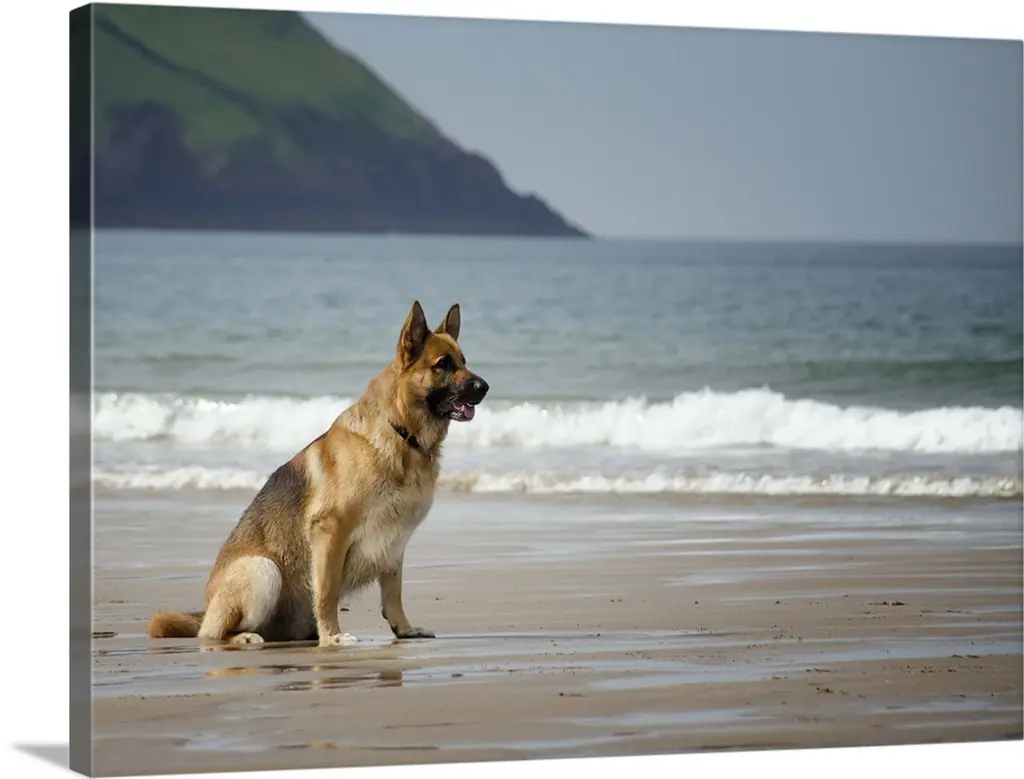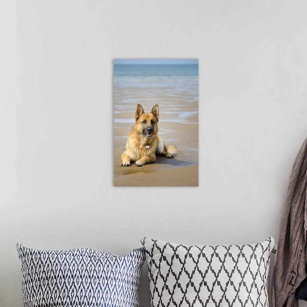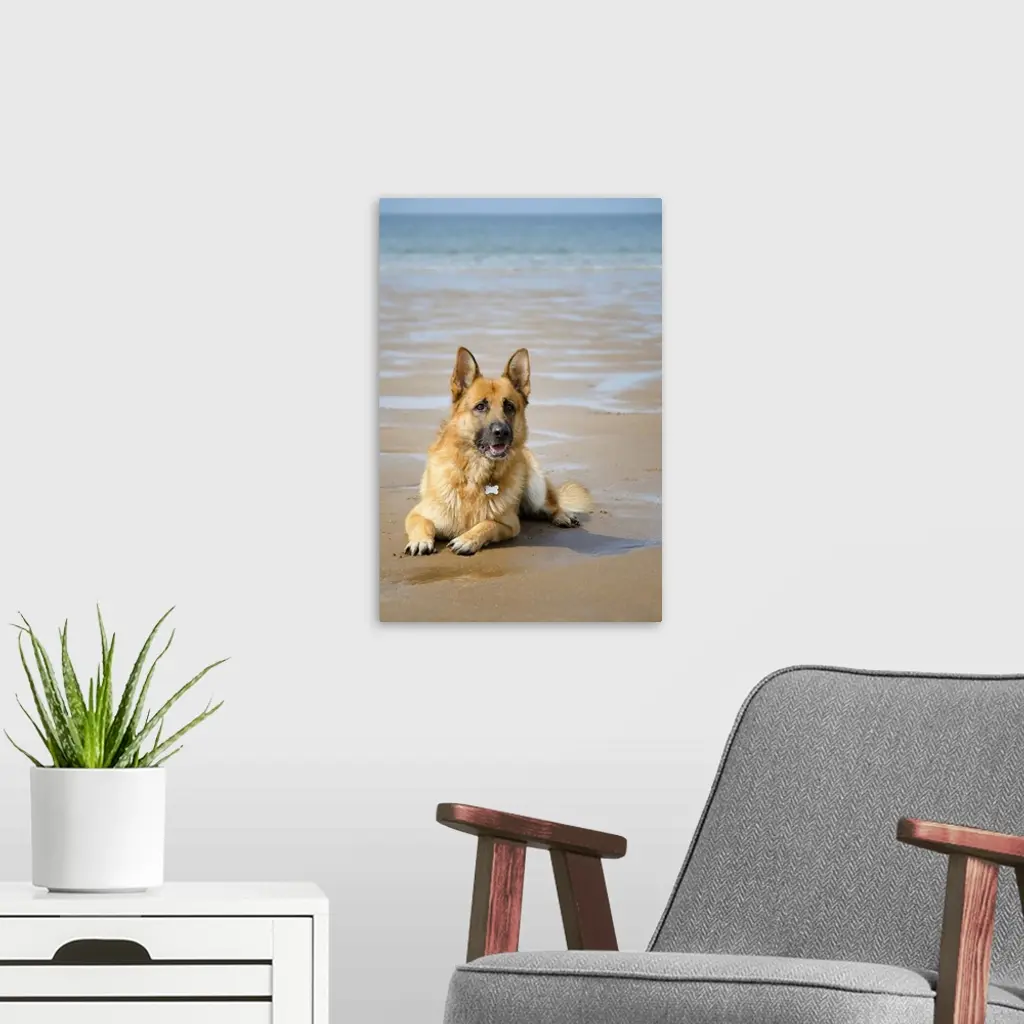 German Shepherd Lying Down On The Moist Sand At The Beach