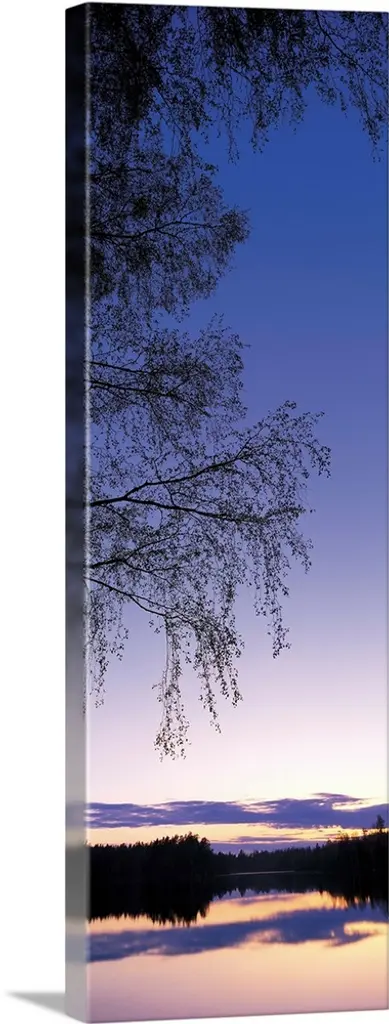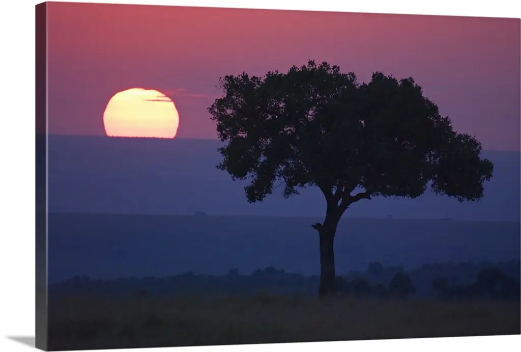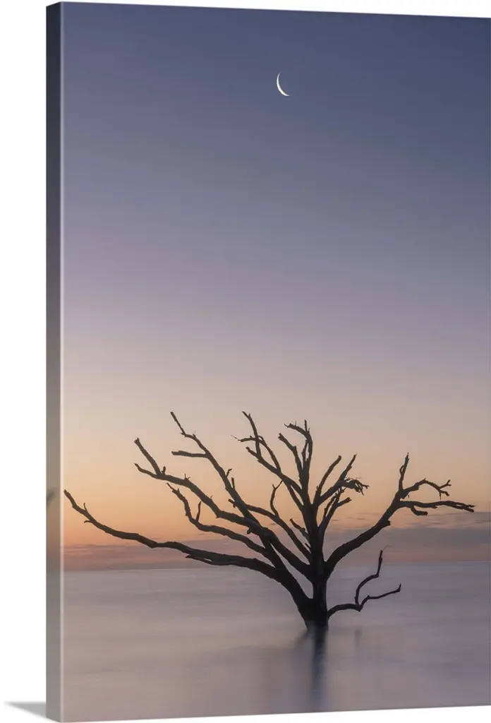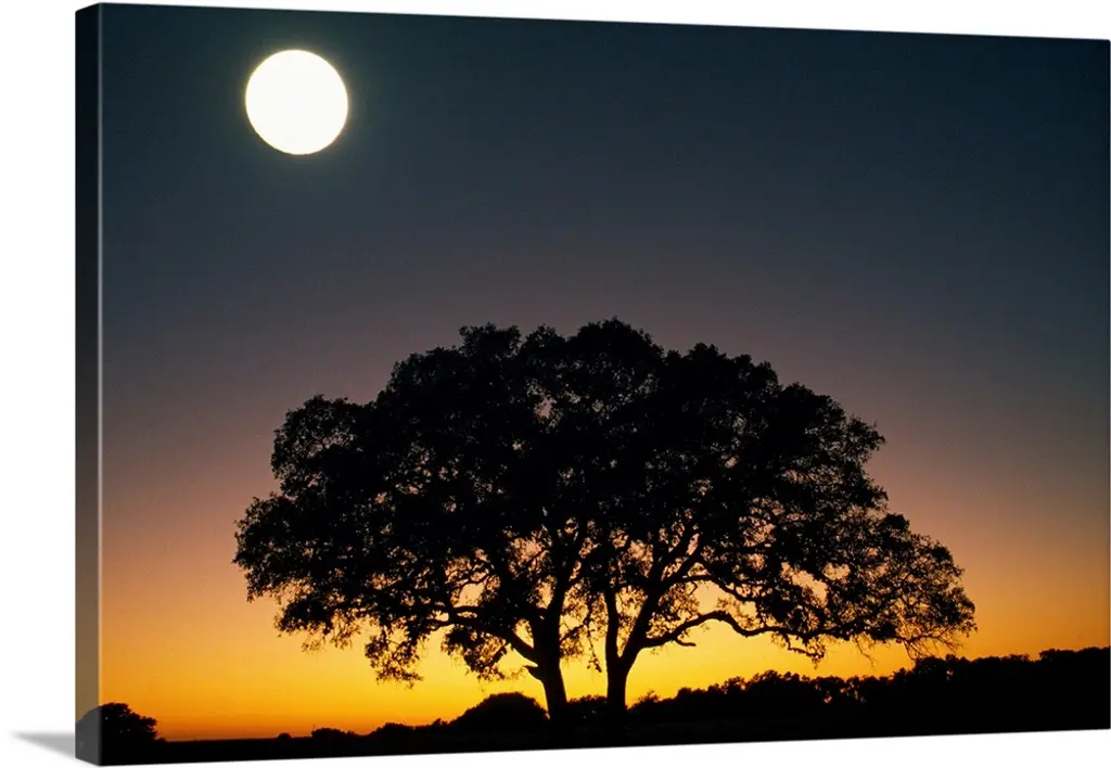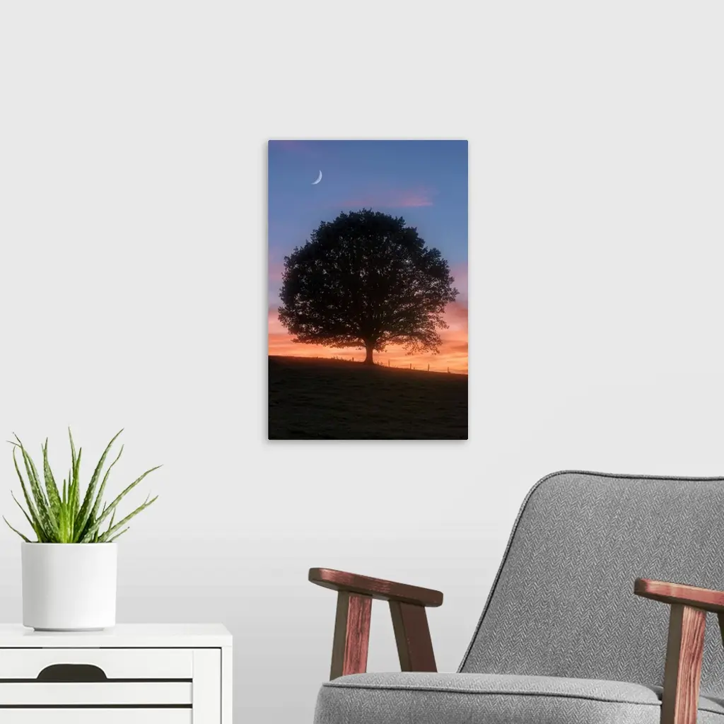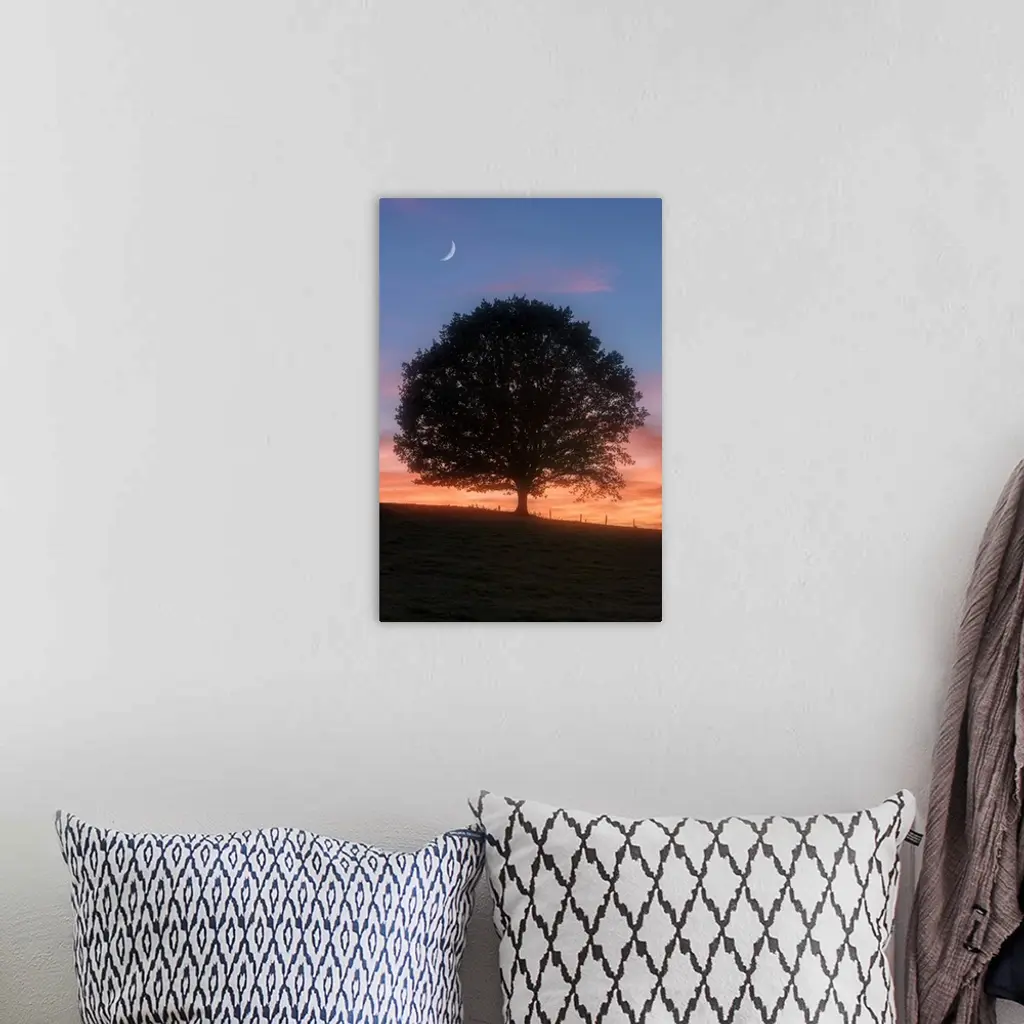 Silhouette of a tree in the evening with the moon above.