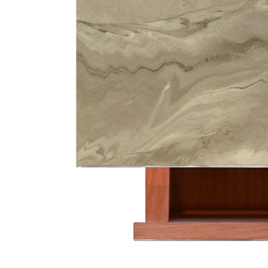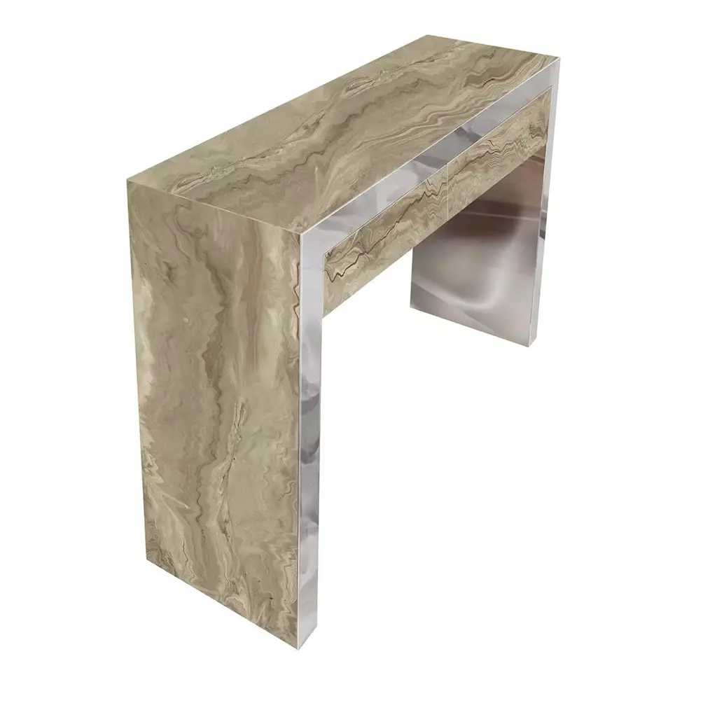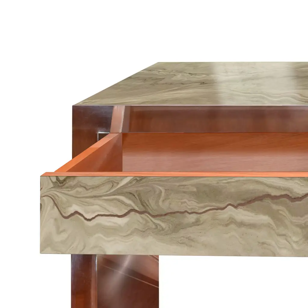 This sophisticated console has a clean-lined silhouette enriched by a superb decoration made of scagliola that will enliven an entryway or living room. The rectangular silhouette with waterfall edges and two front drawers features a polished steel insert that runs along the front of the entire piece highlighting the imposing frame. Showcasing a glossy finish, the scagliola reproduces the natural marble veining in delicate gradients of gray and taupe, playing with the light and the steel insert to create an opulent atmosphere, sure to draw attention in any interior decor.