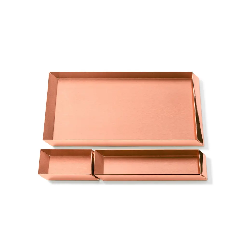 The compositional scheme of this family of small trays is the axonometric isometric projection of two parallelepipeds which creates a three-dimensional optical effect implemented by inclined edges and by contrasting metal finishes. Like in a game, you can get as many configurations as you wish, always creating different designs.Materials:Copper.