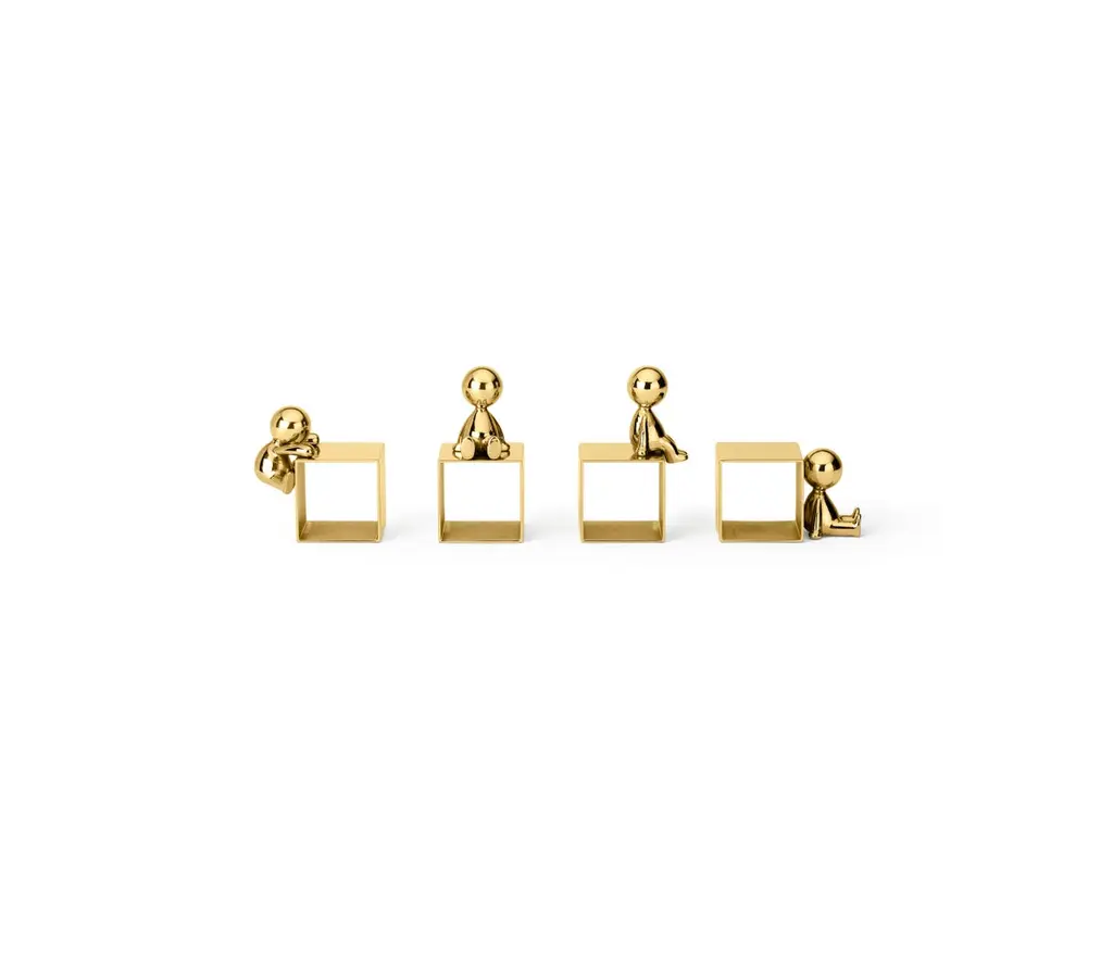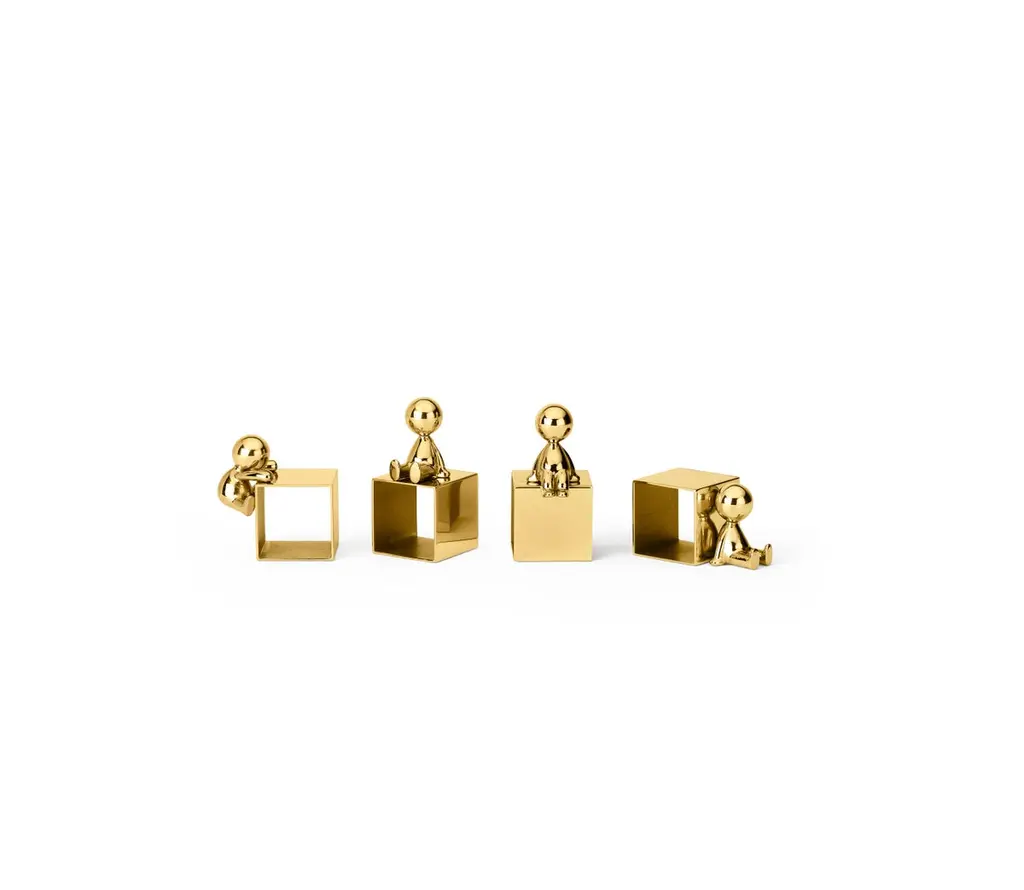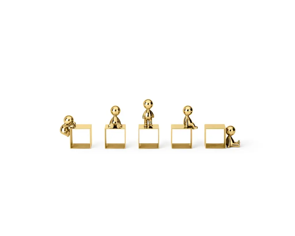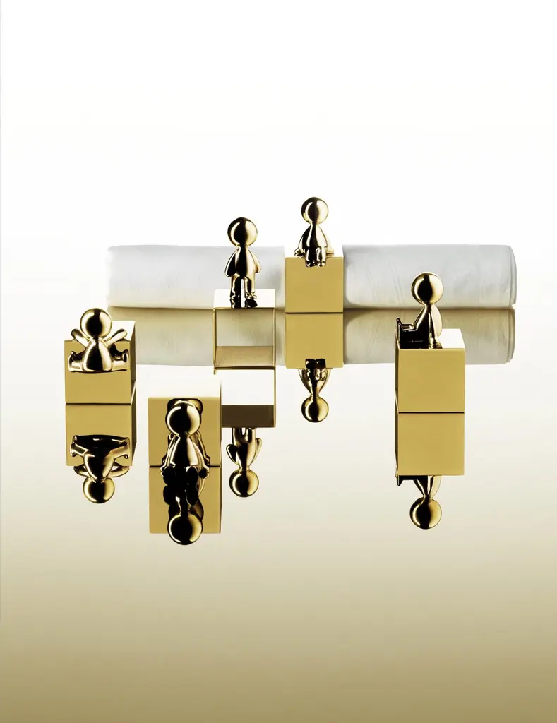 Napkin holder in brassOmini is a family of products that plays on the inclusion and the relationship between the human figure with a series of monolithic objects from geometric and minimalist design. Small Lilliputians attack and animate the pure forms of objects, referring to the natural-artificial and abstract-figurative contradictions that have always characterized the relationship between man and the object.Material:Brass.