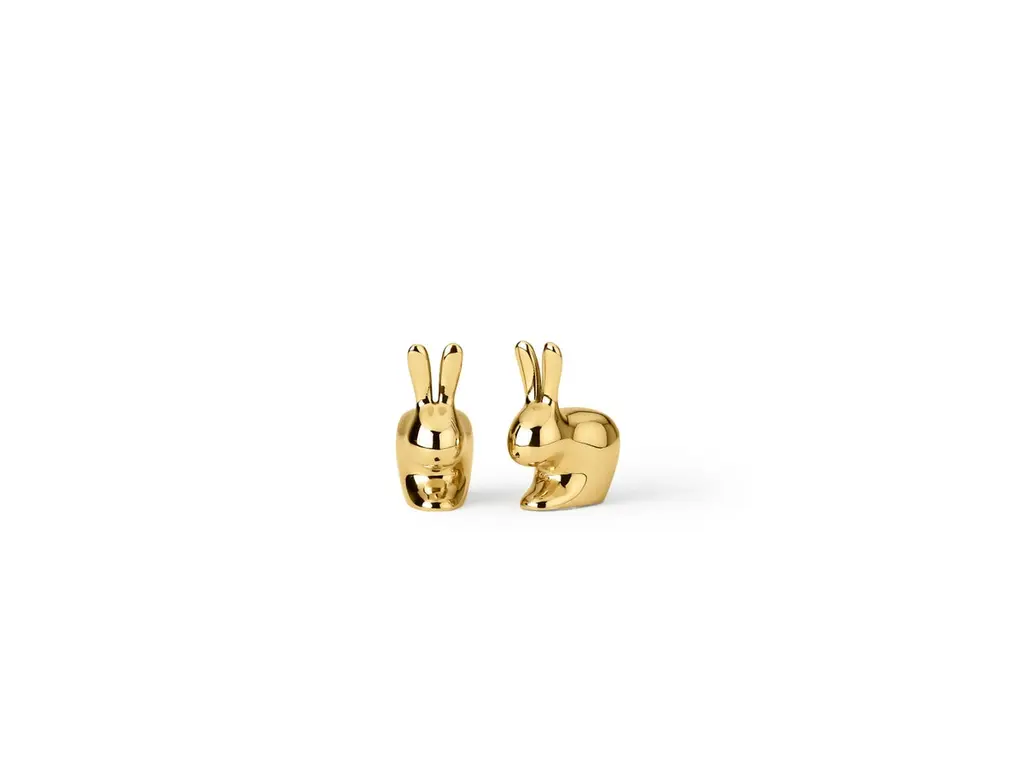 Salt and pepper in brass with PVD treatmentThe rabbit is the latest iconic object I have designed.For Ghidini it has turned into a family of precious metal objects: salt and pepper, paperweight and doorstopper. The rabbit is a gentle animal, sweet and tender. In different cultures, both Western and Eastern, is a symbol of sweetness and fertility, is a sweet and auspicious object that brings good luck and good wishes.Material:Brass with pvd treatment.
