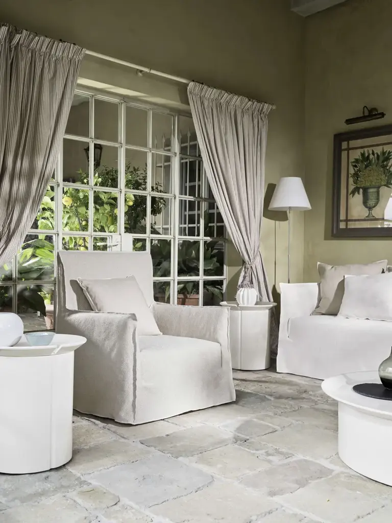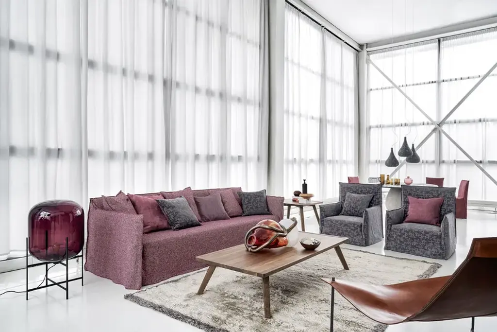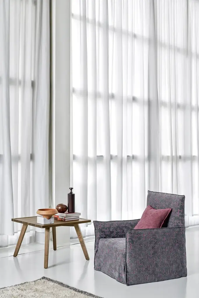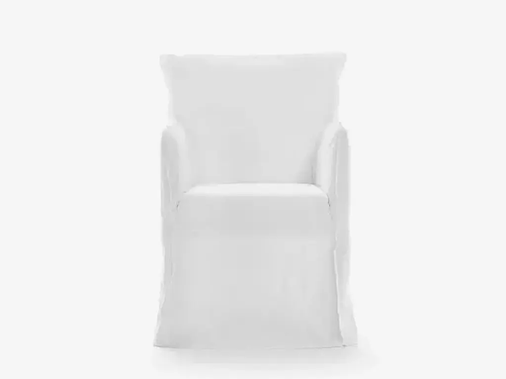 Ghost 04 is an armchair, upholstery with polyurethane foams, removable covers. One back cushion in dacron and down 50 x 50 cm. Supplement for sewing in special colour. Supplement for fire retardant foams. Surcharge for fire retardant interliner.The armchairs of the Ghost family have backrests with different heights and seats of various sizes, have a thin, minimal structure padded with polyurethane foam and loose cushions in mixed down. The main feature of the Ghost armchairs is the removable cover, an oversize housse whose shape is underlined by the visible stitching, allowing it to be put on and taken off in a flash. A textile product that easily changes appearance, allowing you to go from an elegant to an informal look with ease and speed.Comfort and versatility are the keywords that define Ghost, a collection of seats that are as comfortable and enveloping as their upholstery. The name of the collection is inspired by the white version which, thanks to the soft falling fabric, brings to mind the common imagination of ghosts. The large collection Ghost seats is developed around a light body with essential volumes that contains soft cushions. The main feature is the upholstery: an oversized housse whose profile is underlined by the visible stitching. Sofas, armchairs, ottomans, chairs and beds are undressed and dressed in a flash, like a change of clothes, taking on a different image each time, simple or sophisticated, depending on the personality of those who choose and live them.